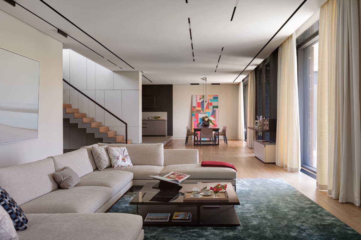 The interior style is characterised by sophisticated minimalism, prioritising both comfort and functionality. Among the notable design brands featured in the project are upholstery furniture from B&B and Poltrona Frau, wallpapers by Hermes, suspension lighting from Luce&Light and Flos, the Mesh lamp designed by Francisco Gomez Paz for Luceplan, and the iconic Magic Spun chair by Thomas Heatherwick for Herman Miller, among others.