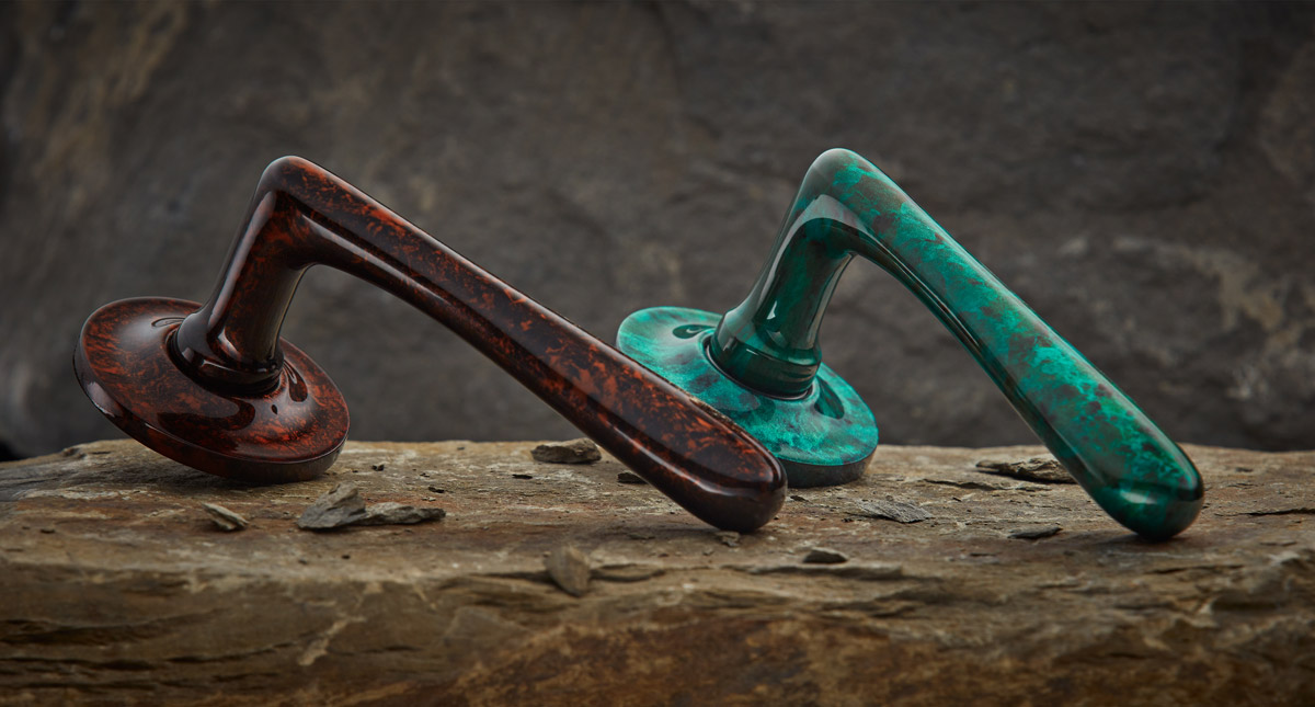 Autumn Bronze, a rich and warmly textured living finish with an array of brown and red undertones. Over time, the finish develops a soft patina through use, gradually revealing the metal beneath, creating a stunning aged effect which beautifully complements the rich heritage and preserved character of the villa.