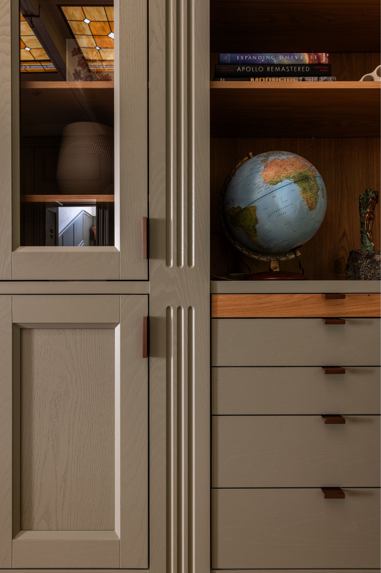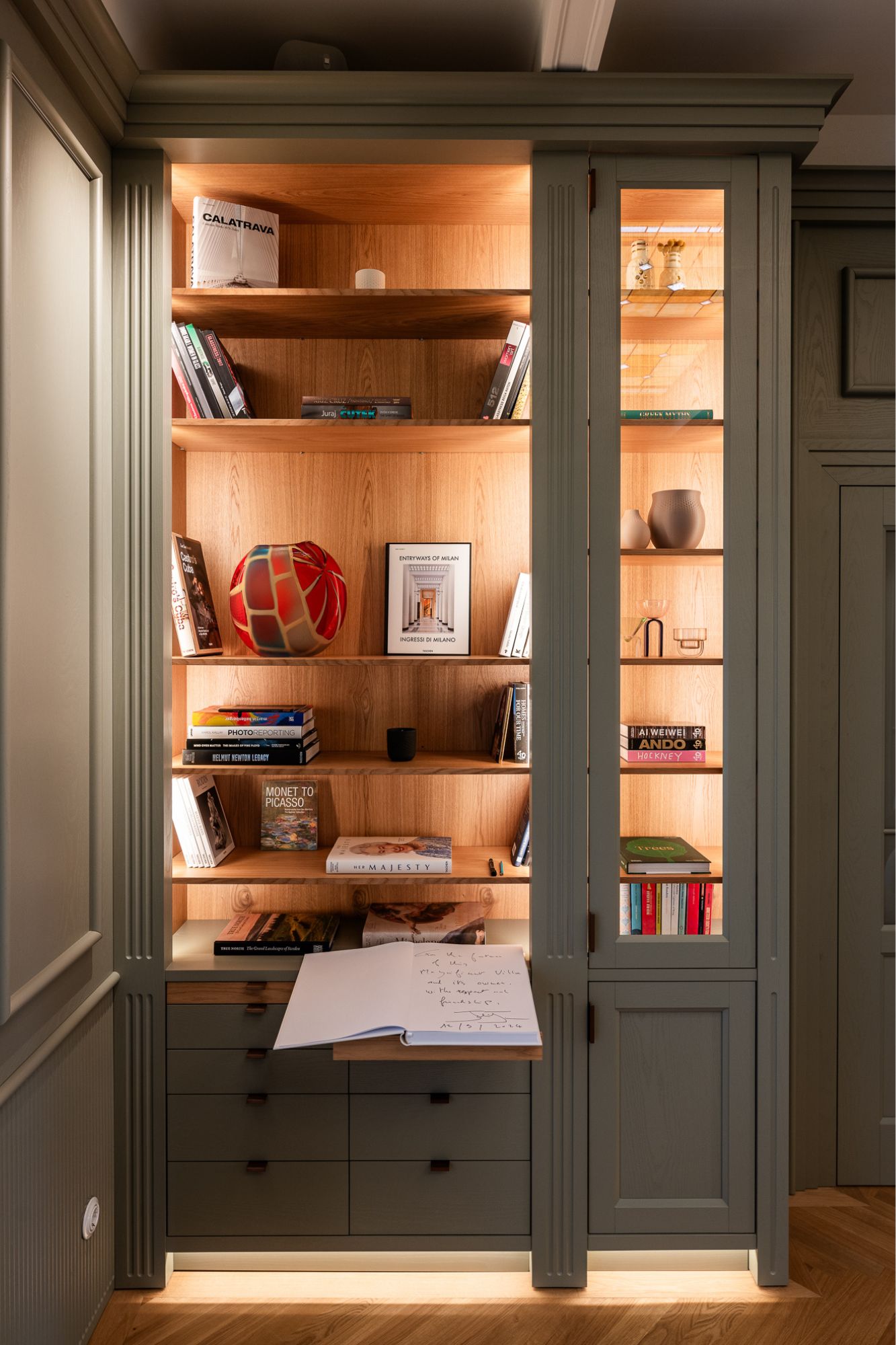 A room promoting relaxation, the library features soft, dusty sage cabinetry complimented by the warmth of wooden internals and backlighting.