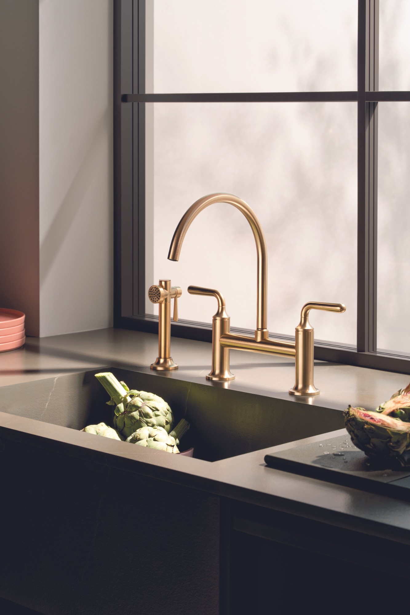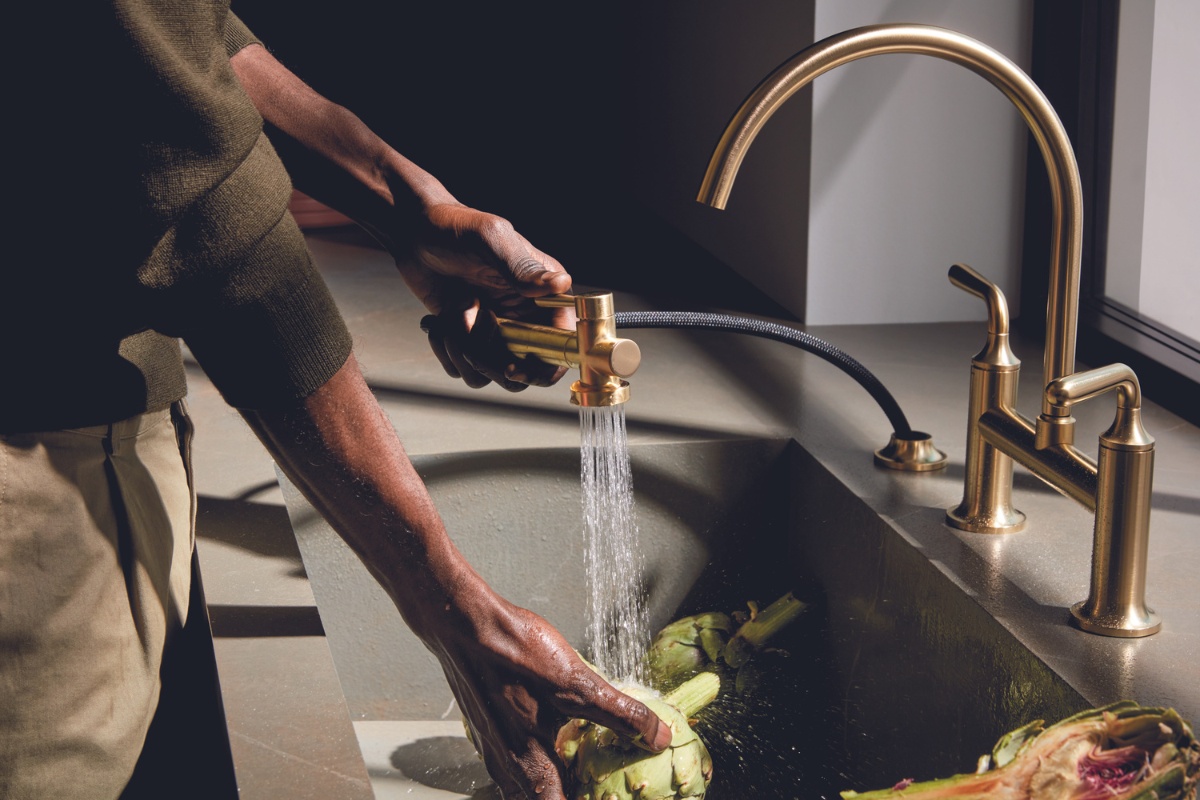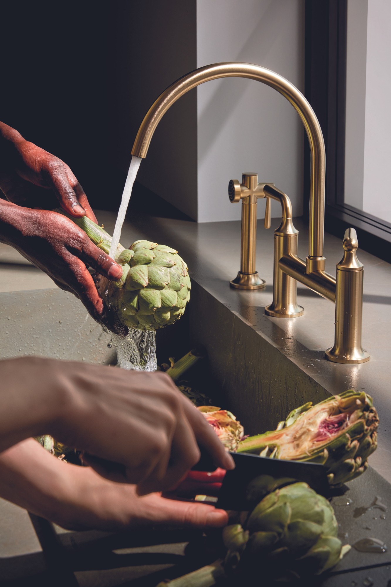 A real highlight: the bridge mixer A wide-ranging product programme is available, covering many areas of application: Vaia as a single-lever mixer, for instance, can have both a pull-down function and a rinsing spray on the side. The American style bridge mixer will be the highlight in any kitchen: It is available either as a three-hole variant with a pull-down function, or as a two-hole version with a rinsing spray on the side – both come with either a teardrop-shaped lever, or the classic cross-handles. A Bar Tap and a Pot Filler complete the series.