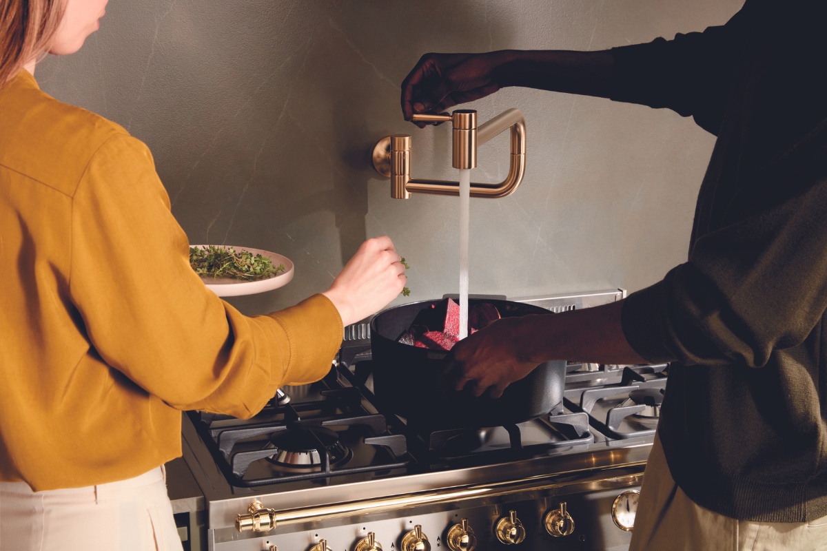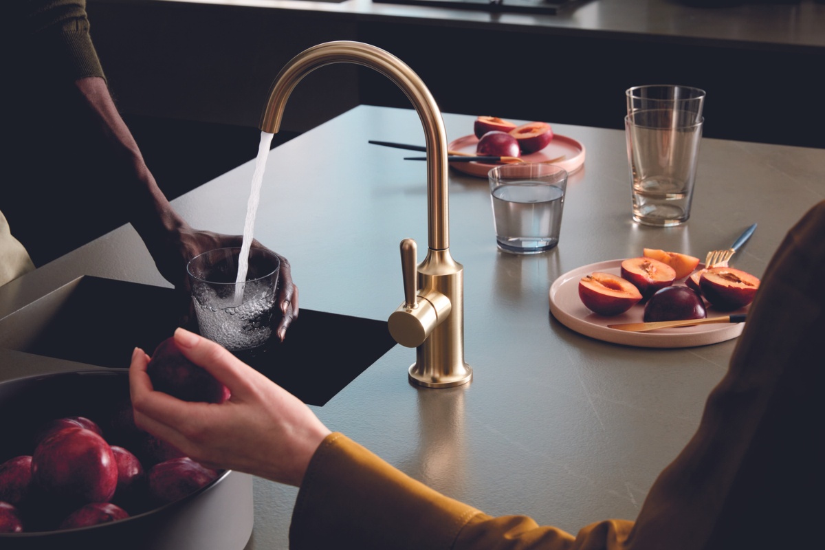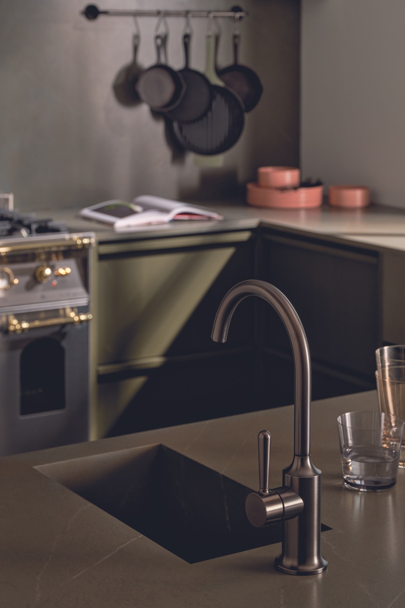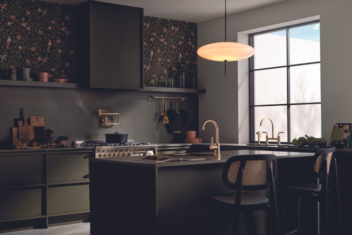 This is also true for the new “Metropolitan Eclecticism” architecture. Here the open-plan kitchen acts as the focal point of life together, where favourite recipes are cooked, and culinary experiments as well as lively discussions take place. The freestanding island and bar stool design mixes a modern country house style with contemporary elements: Kitchen wallpaper, varnished wood, and natural stone, together with stainless steel and geometric shapes, create a pleasant, sociable atmosphere. Vaia is quite at home here, and both the warm gold Brushed Durabrass (23kt Gold) and elegant Brushed Dark Platinum finishes are equally convincing – as they show innovative ways to combine tradition and modernity.