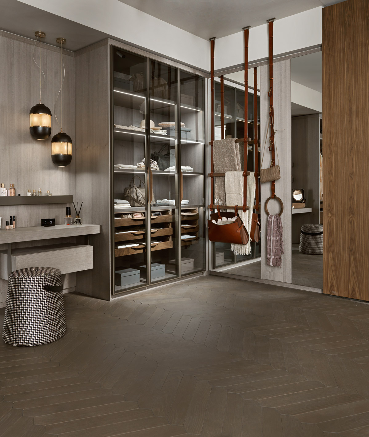 The Spina Jazz in Ca' Gabriel finish brings the rhythm of the herringbone parquet to the bedrooms, revisited by Foglie d'Oro with a contemporary soul: its serial interlocking corners create an airy, embracing design, perfect for creating a synthesis of comfort and luxury.
