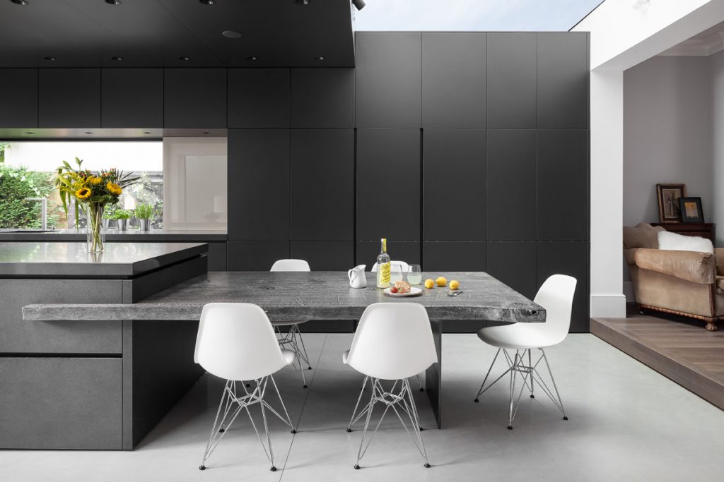 The monolithic look of the kitchen was inspired by the striking architecture of the building, which was instrumental in deciding on the layout and design of the overall kitchen. Working closely with the Architect, Jason Coleman at Robert Dye Architects to develop the design, we achieved the dramatic look we were aiming for by choosing a dark graphite for the wall units and continuing the colour and lines of the design up and over the ceiling and into the skylight, which further emphasised the architectural elements. Over hanging the doors to completely hide the plinth and create a small shadow gap between the doors and the poured concrete floor added further to the striking effect.