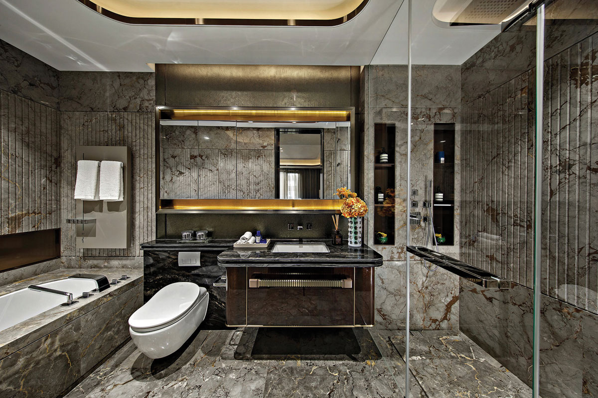 In the end, the design team were able to create a space that satisfied all the needs of the owner. From the colour palette to the material selection, the design director hand-picked fabrics, upholstery and wallpapers in Italy and created a chic home space with an official work station tailored for business. Sophistication and extravagance is demonstrated through the use of lacquered wood, hand-woven leather finishes, grey patterned marble, silk finishes and brushed stainless steel finishes, etc.