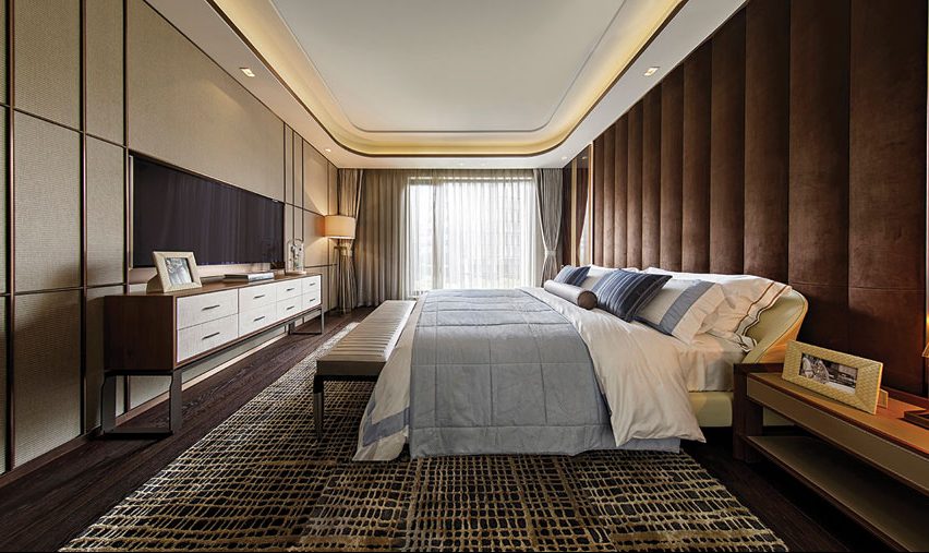 In the living area, the Portugal Grey marble flooring perfectly matches the jade marble TV wall, exuding ultimate elegance. The graceful accent continues in the adjoining dining area with the Shangri-la black marble mini bar creating a subtle yet elegant space. The master suite is topped with dark-oak flooring and light carpet to illustrate a contrasting visual effect of warm and cool colours, conjuring up a holistic luxury experience. In bedroom two, the brown palettes work together with the glossy wood finishes create a luxurious, streamlined look. With carefully selected materials and furniture, the designer has arranged the space with a contemporary approach, creating a refined, tasteful and luxury residence for its owners.
