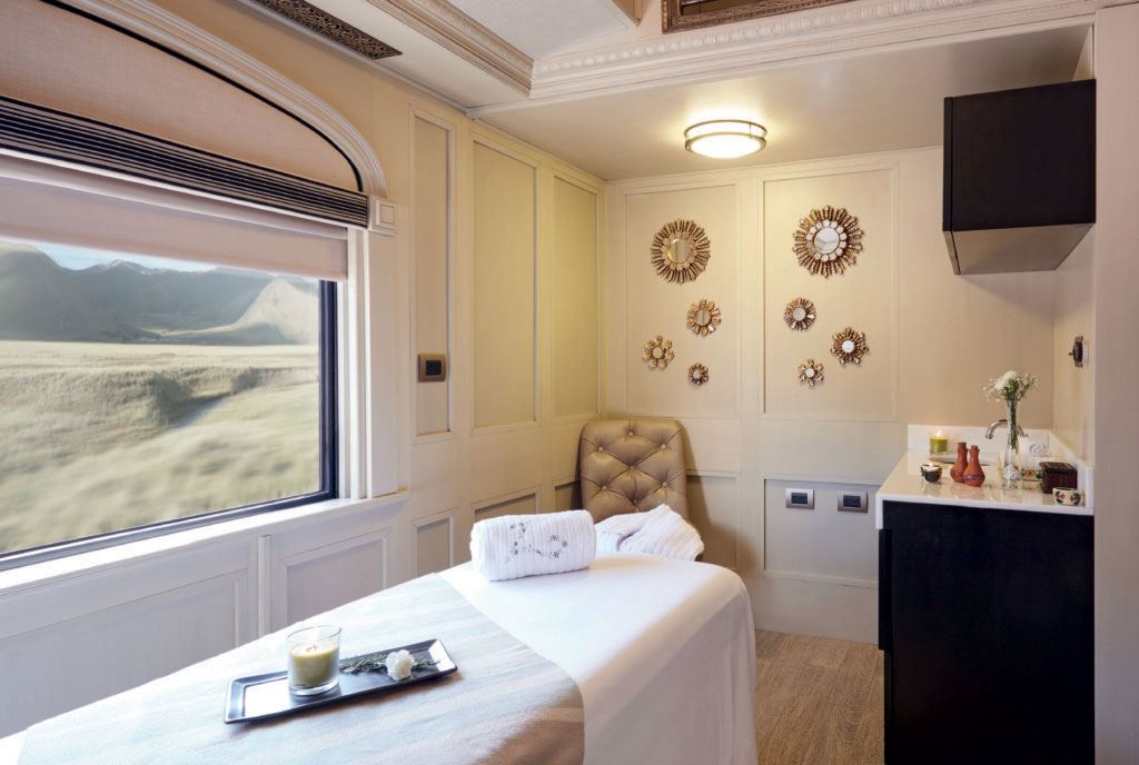 In the Observation Car, guests can enjoy nearly 360-degree views, either leaning against the scrolled balcony rails or relaxing on the central round seat. Inside, the bar is furnished with traditional embossed leather chairs and cosy sofas. The elegant Piano Bar Car offers a more formal ambience with a corner bar at one end facing an impressive grand piano at the other, and a palette of refined grey tweed with splashes of cornflower blue and golden yellow. The spa is formed of three treatment rooms painted a soothing shade of white to inspire a sense of stillness and relaxation as the colourful landscape whirs past.