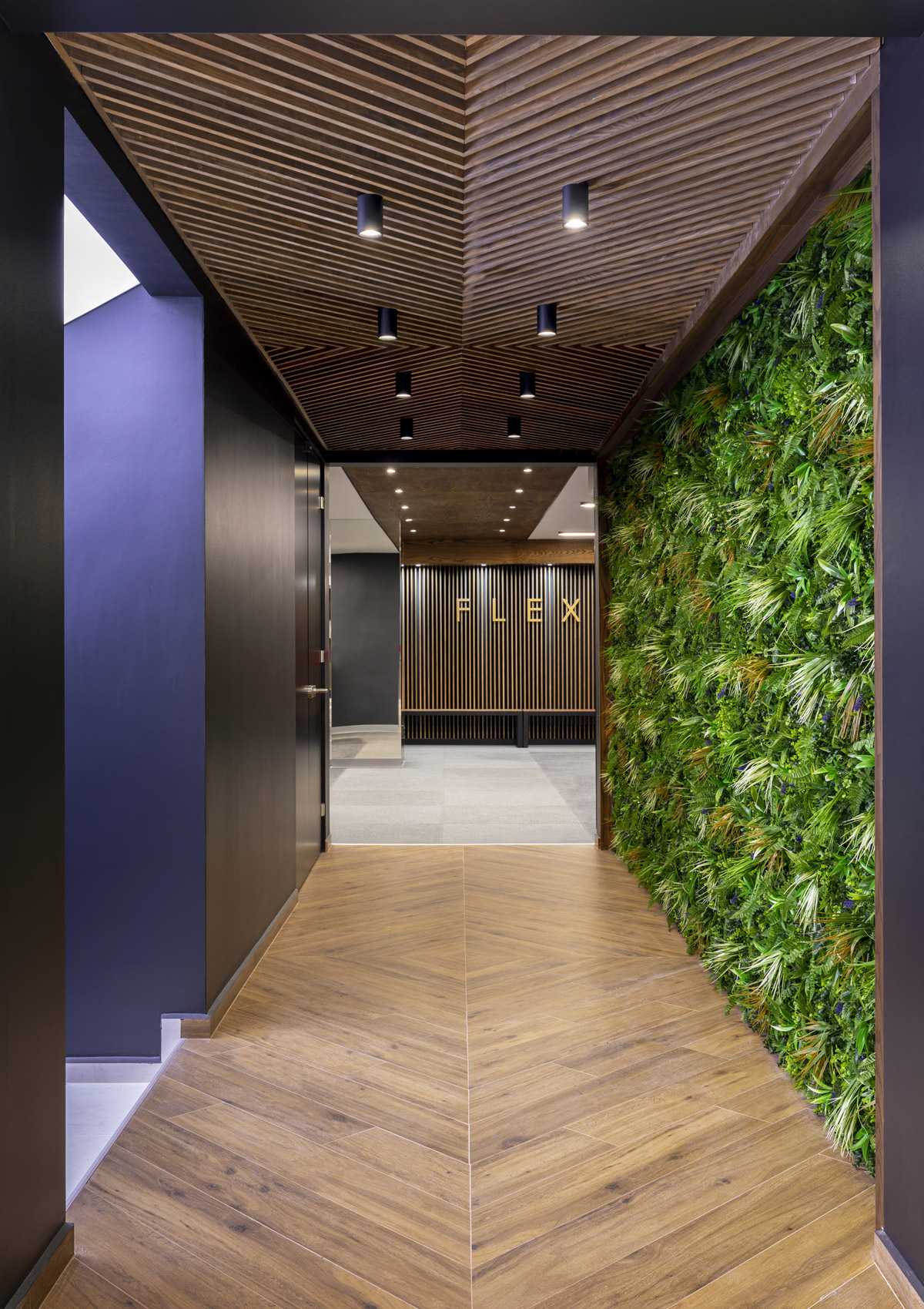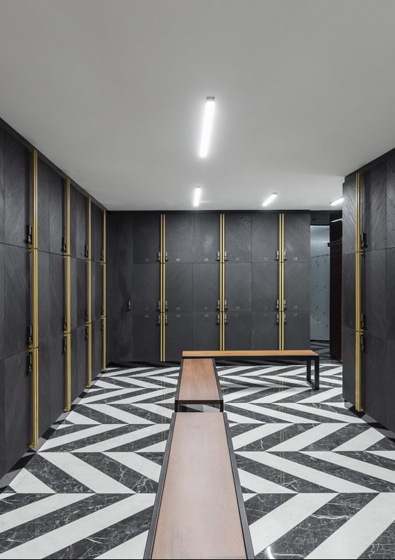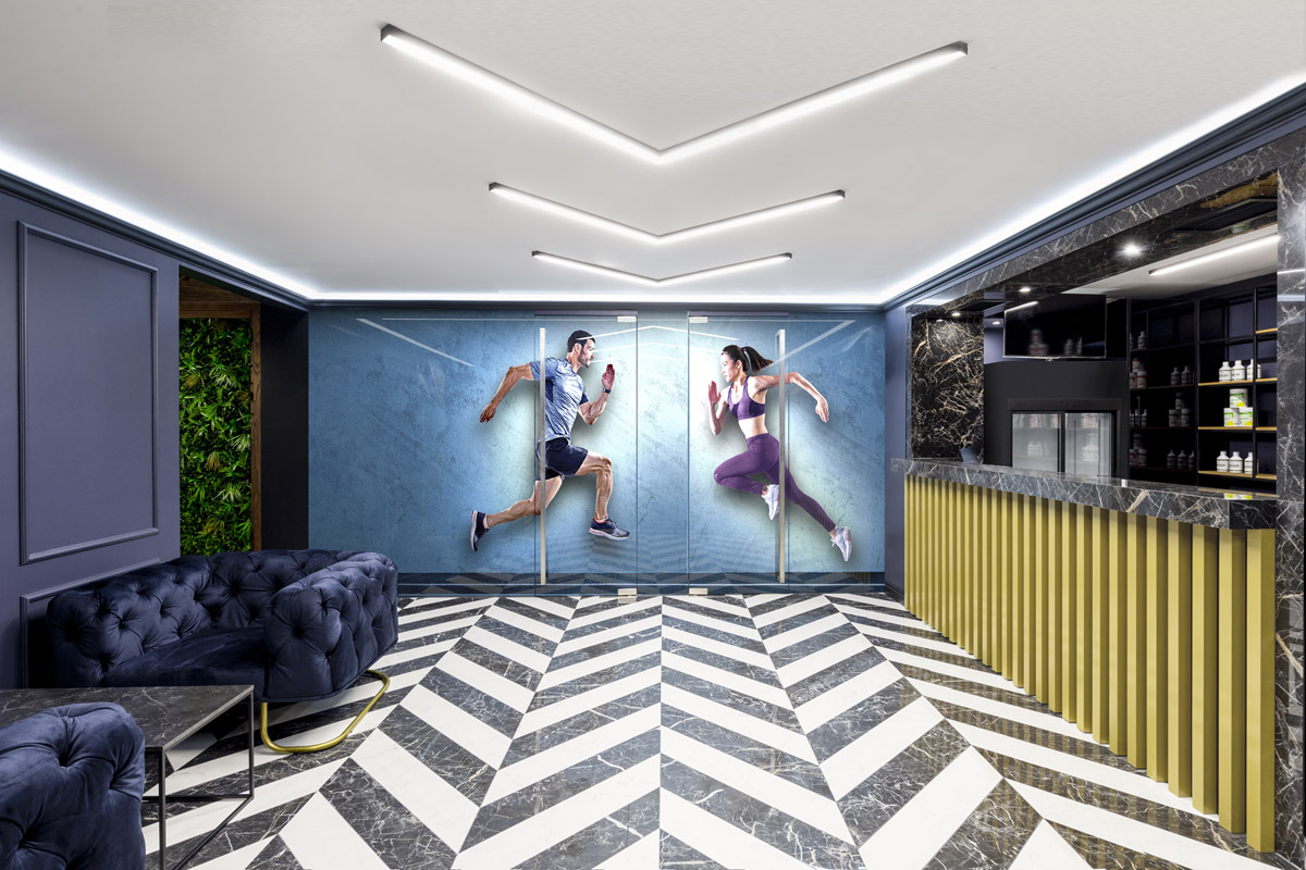 We all fell in love with the black and white marble chevron tiling by Marazzi at entrance. Creating different zones within the space by switching up the colour or the material of the flooring altogether was a very fun design approach for us which would not have been possible in a different space. The flooring is all special non-porous, antibacterial virgin rubber by Paviflex which no water, liquid or sweat can penetrate, making the space safer, more hygienic and ease to clean. We wanted our design to be captivating but also functional.