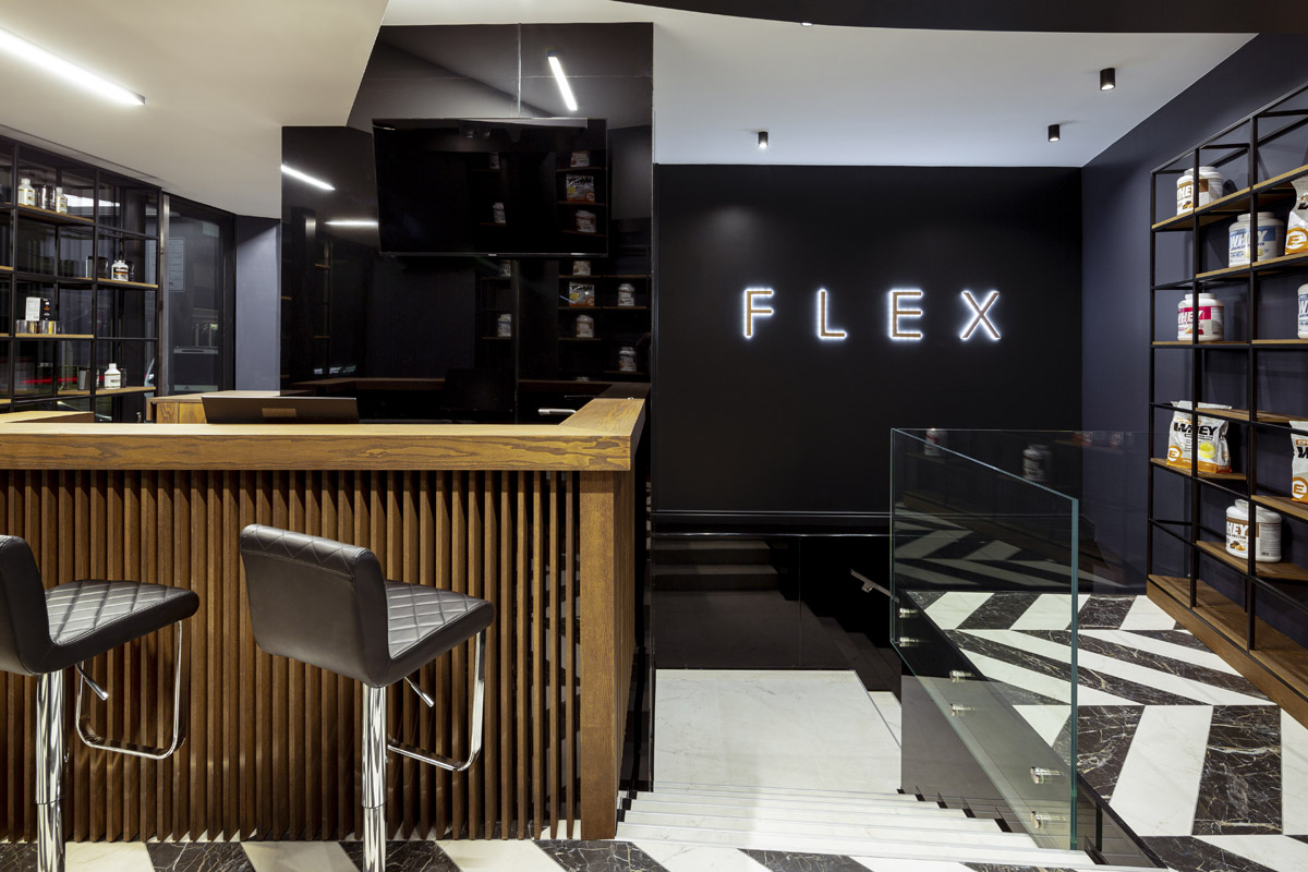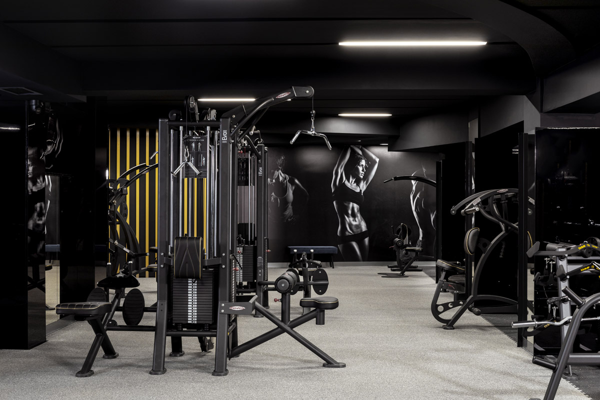 The client wanted us to convert an old abandoned communist restaurant underground into a new, inviting and playful fitness space. The interior had to have a dual function – once as a gym and then as the official showroom for the Balkans/Eastern Europe of the Italian handmade gym equipment brand – Panatta. Fitness Flex is a chain of gyms and our purpose, upon the client brief, was to completely rebrand it, so we adapted the space guided by the concept of "Flex Goes Green and Gold” and split the two floors into a “Green” Cardio Floor with lighter colours, wood and mirrors and a “Gold” Floor for heavy weight-lifting with black and gold accents.