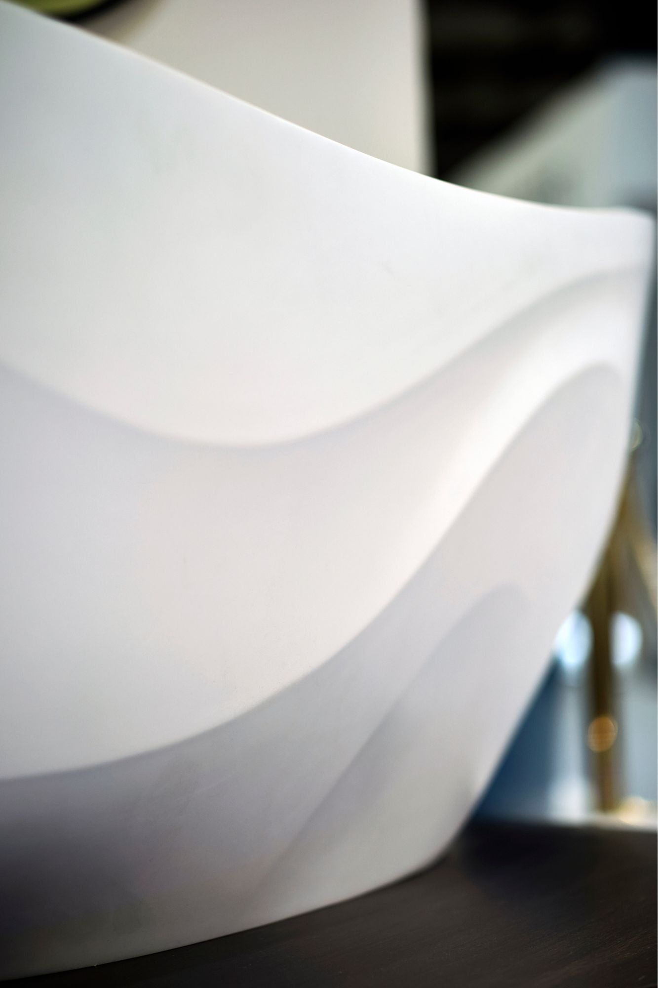 The interior space is marked by the use of wood and wall-hanging installations. Matched with Griante chairs is Anemos table, with glossy finish and oval top, illuminated by the horizontal pendant Kawara lighting. To the side, Blume Sideboard, the new piece of furniture designed by Sebastian Herkner, finds its space. Blume Sideboard echoes the sophisticated flower-shaped profile in extruded aluminium of the homonymous collection. Blume Sideboard combines storage capacity with the ability to define or divide spaces with elegance and versatility. It features four curved plywood ash wood or walnut veneered doors combined with extruded aluminium legs in a variety of anodised or power coated finishes, in addition to a composite marble or high pressure laminate top. With its elegance, it helps define a relaxation area within the space, where Ester Lounge armchairs by Patrick Jouin, distinguished by soft and generous shapes, and Blume coffee table, also designed by Sebastian Herkner, are placed. Ester Lounge is made of injected polyurethane foam with elastic belts. Proportions have been conceived to gracefully accommodate a wider, cosy seat, on which rests a comfortable cushion, and a backrest with a curved, enveloping design, while retaining the collection's distinctive identity.