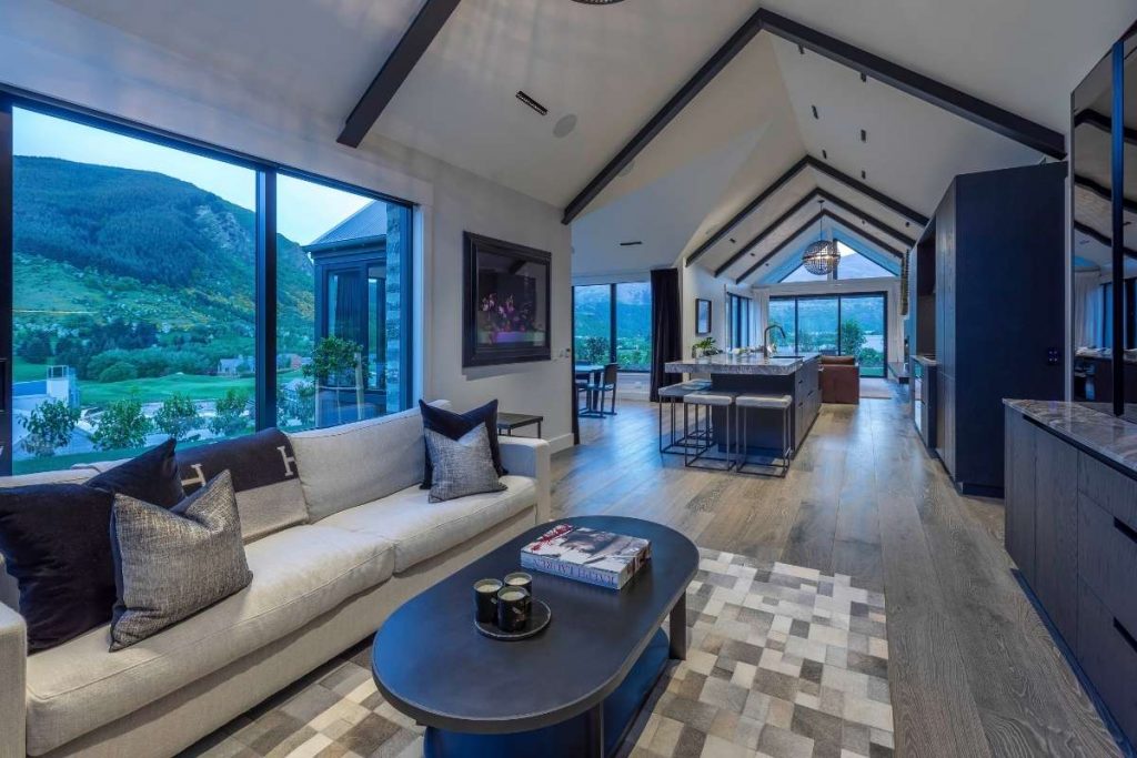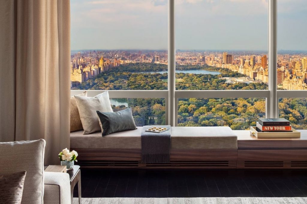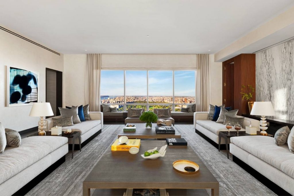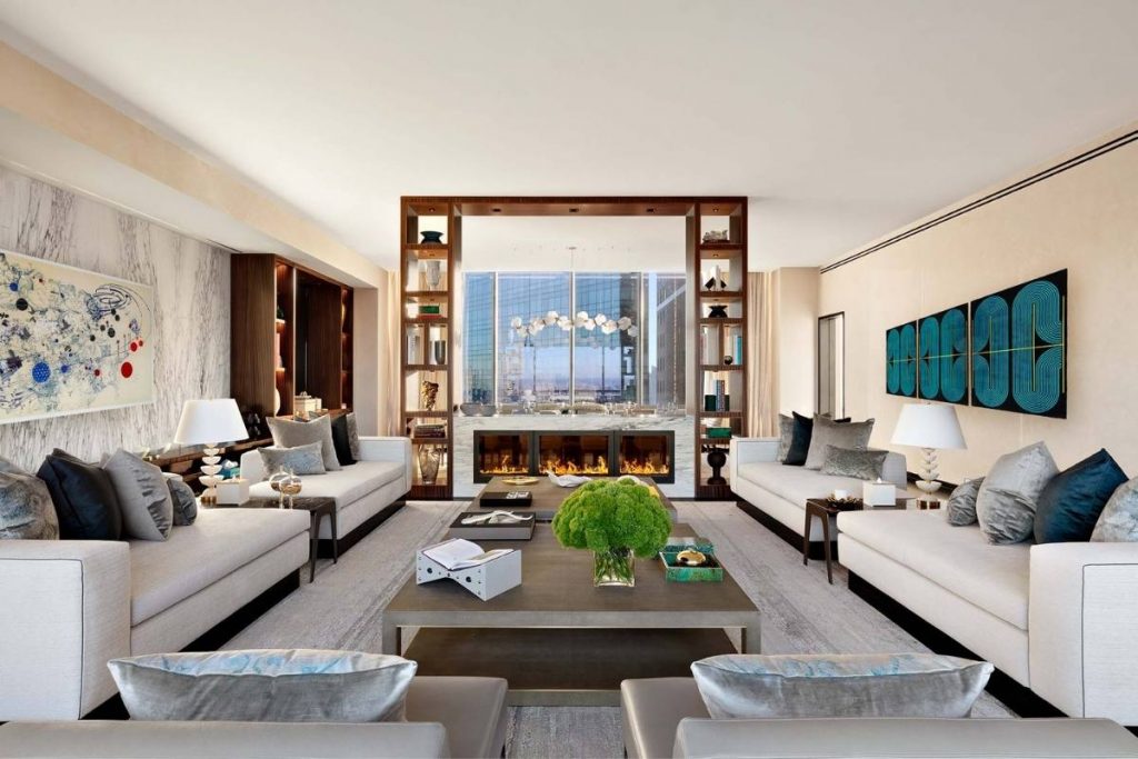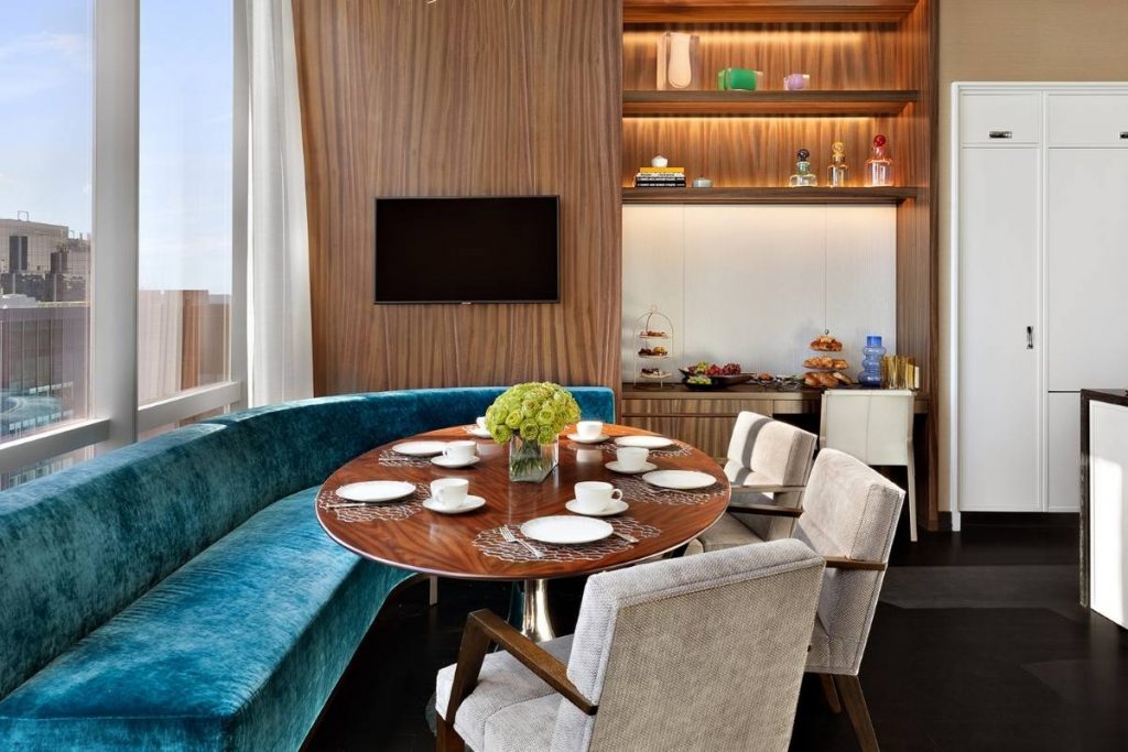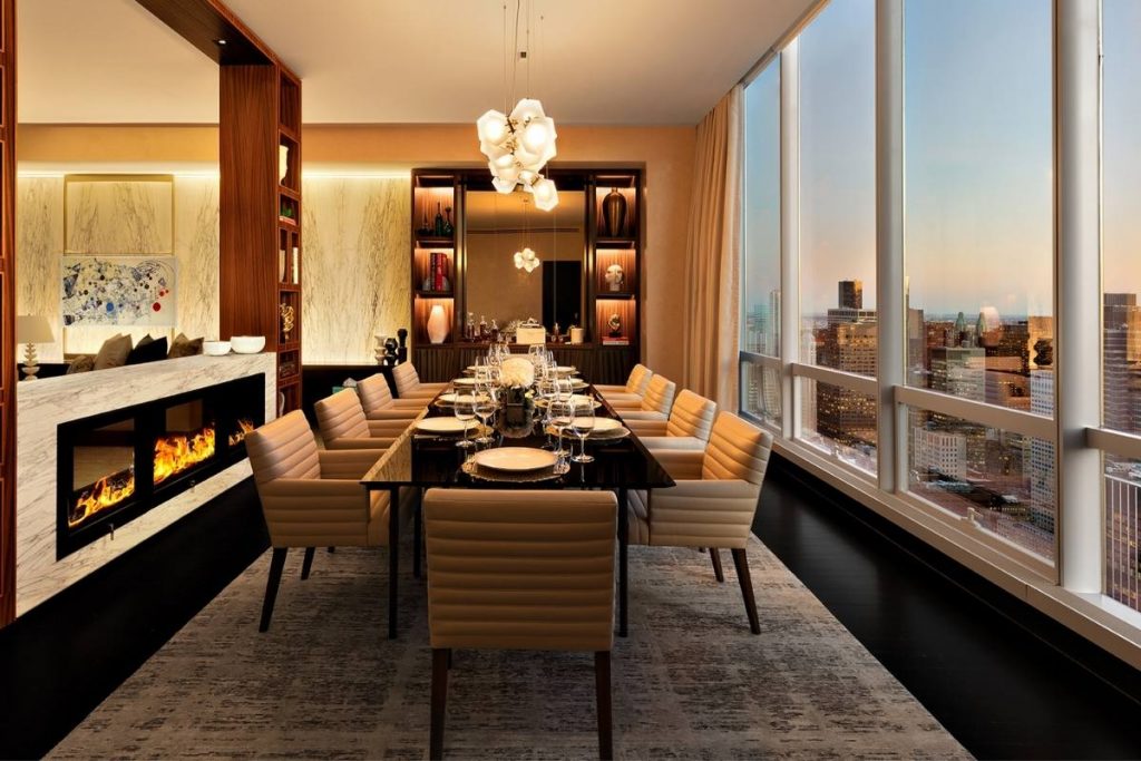 The versatile open-plan entertainment and living room was designed for socialising with friends and family, and comprises a residential living and dining room, with a spacious foyer and adjoining kitchen. The suite is outfitted with the latest technology, including a state of the art 75-inch television, and panoramic windows run the length of the entire wall, bathing the space in natural light. With panoramic windows running the length of the entire wall, the voluminous space is outfitted with the latest technology including Lutron controlled lighting. High gloss lacquered panelling and doors were used throughout to give the suite a timeless yet modern feel.