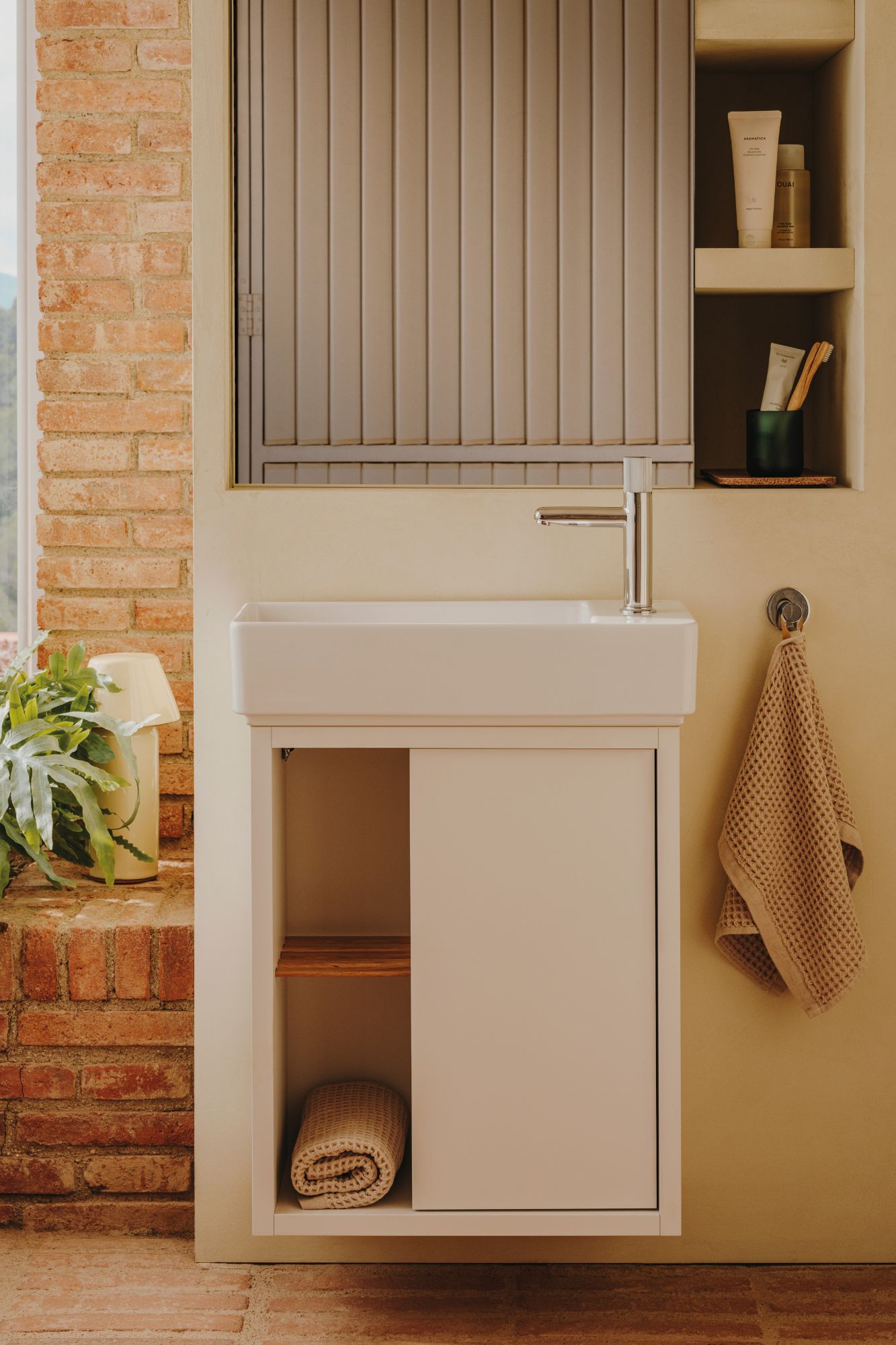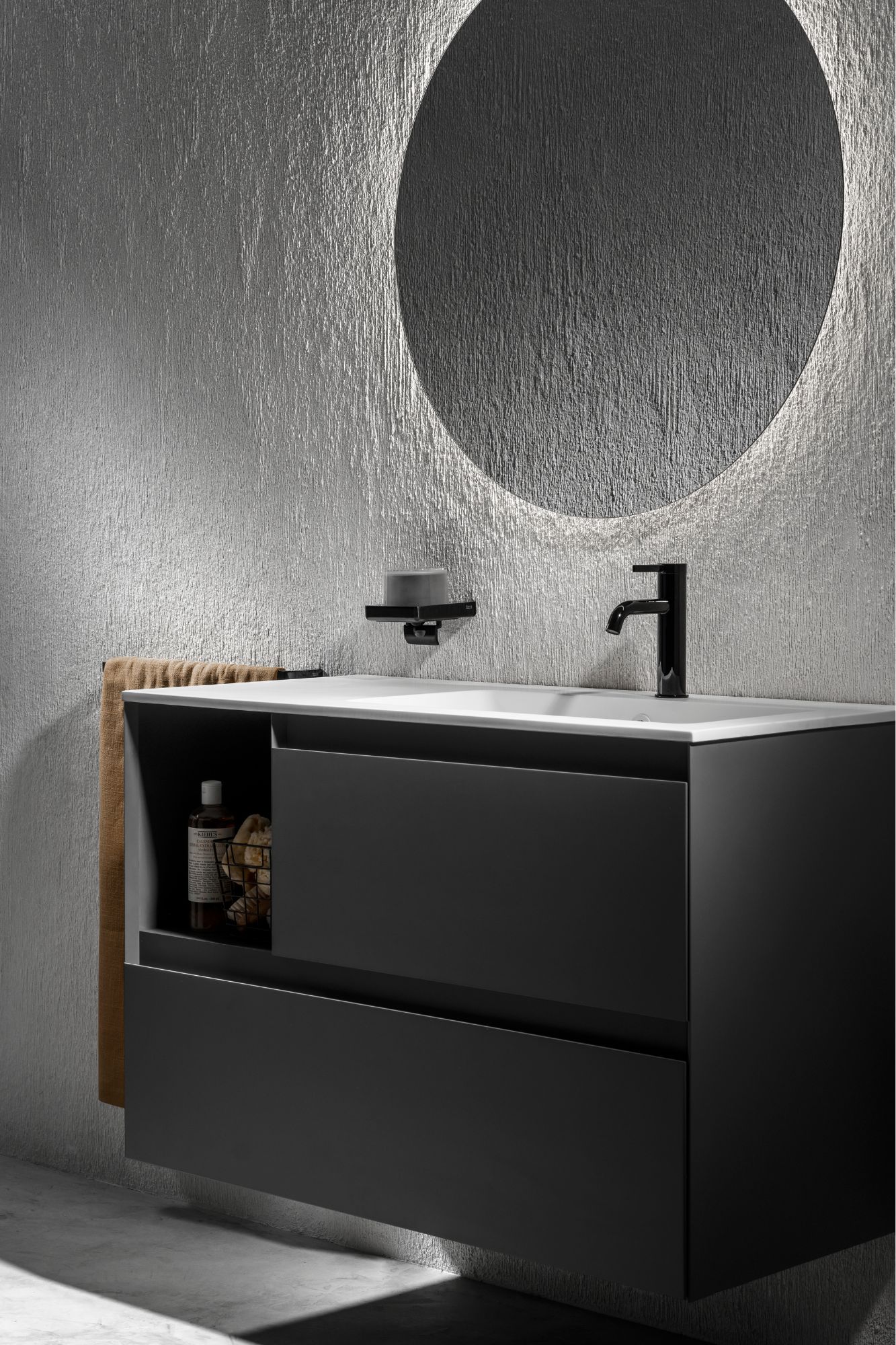 Designed by Altherr Désile Park (ADP) and led by Jeanette Altherr, Meridian draws inspiration from Mediterranean architecture. The basin is rectangular in shape, but it contains a softly curved oval bowl within, to create an overall form that is light and flowing. The basins can be either be paired with a steel frame or a vanity unity – but in both cases, the straight lines are softened by the delicate contours. Storage solutions such as metal boxes and drawers ensure a clutter-free space, while a natural palette of White, Black and warm Beige wood tones reinforces the collection’s organic appeal.