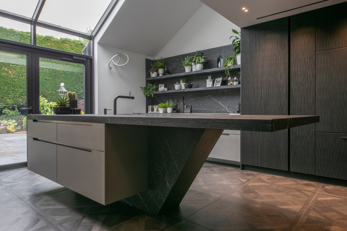 The standout feature is the marble-wrapped island with the cleverly concealed breakfast bar. With discreet underfloor cabling rising through the leg to a hidden power socket beneath the Neolith iron-finish surface, it functions seamlessly as both a stylish bar and a functional workstation with a direct view of the garden.