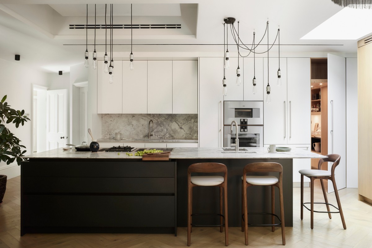 The design was influenced by the need for a sleek, contemporary kitchen that marries dark, dramatic finishes with organic warmth. The contrast of black spray-painted cabinetry with walnut veneer introduced both depth and natural texture. The marble-wrapped island, in Calacatta Apuana, was selected for its rich brown and black veining—bringing dynamic, organic energy to the space, while echoing the refined simplicity of Scandinavian design.