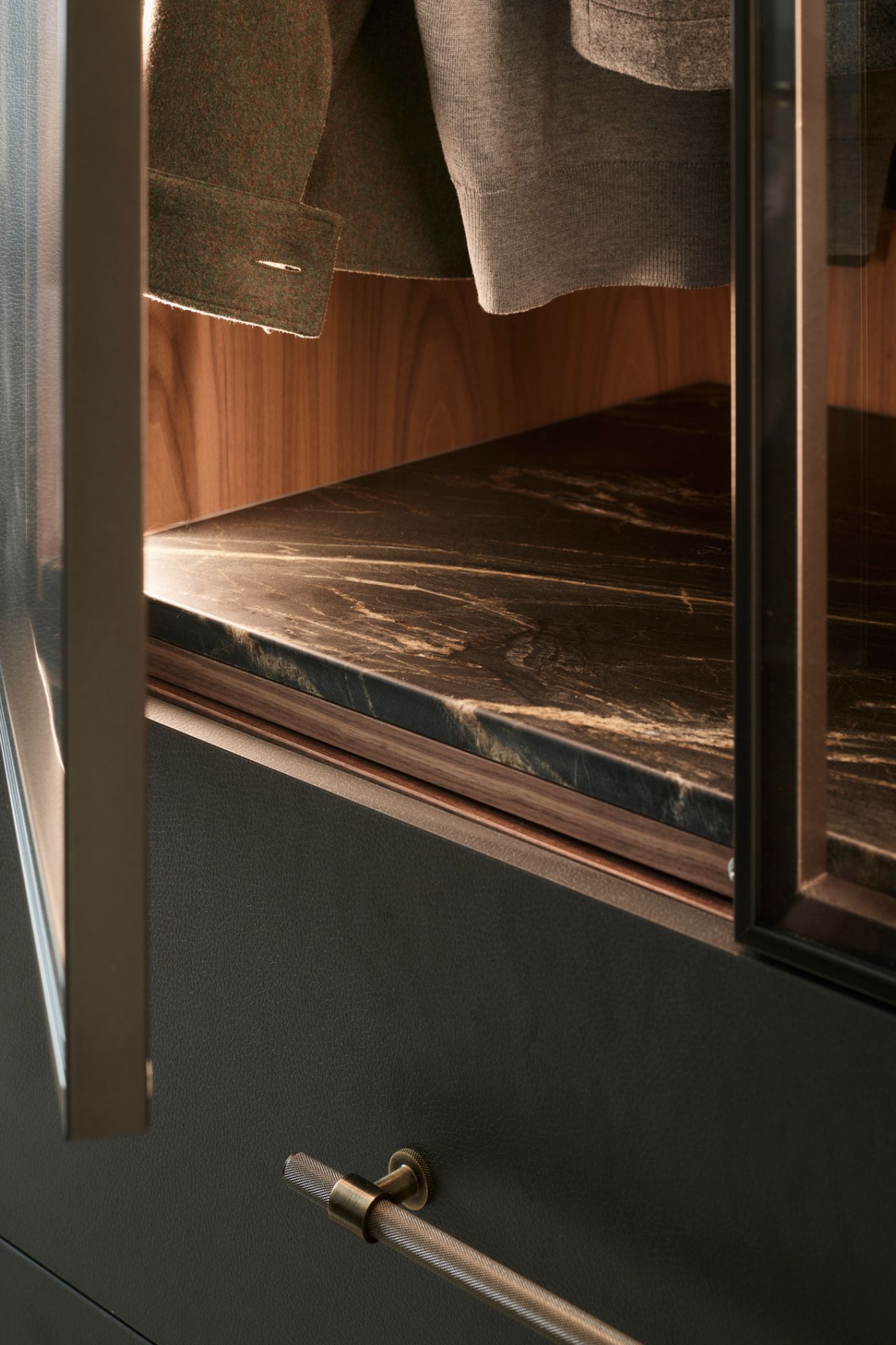 The design was inspired by the client’s desire for balance, something understated yet sophisticated, where every detail contributes to a calm, considered atmosphere. Our use of textured walnut veneers, ultra-matte Fenix finishes, and the dramatic Neolith Calacatta Luxe framing created a refined contrast that feels both warm and contemporary. Further inspiration came from the client’s reference to European design studios, which guided the development of our bespoke solid-brass patinated handles, ultimately becoming a defining feature of the project.