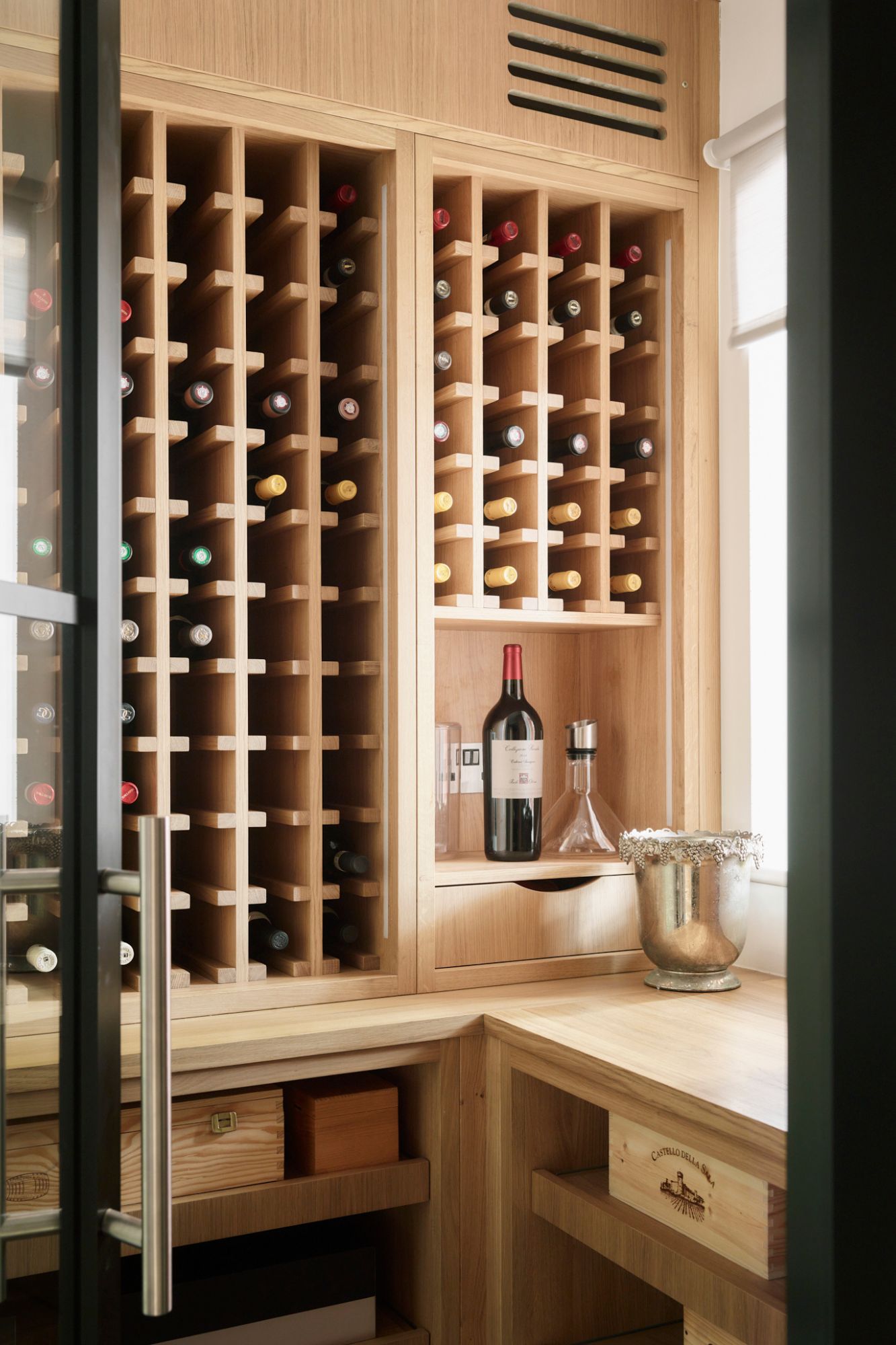 Beyond its visual appeal, every detail was designed for purposeful living, from the bespoke wine display cabinet above an integrated wine fridge to the custom oak ladder and brass rail offering graceful access to tall storage. Hidden pantry space keeps the design sleek, while textured materials and layered finishes create a space that feels luxurious, personal, and built for a lifetime of use.