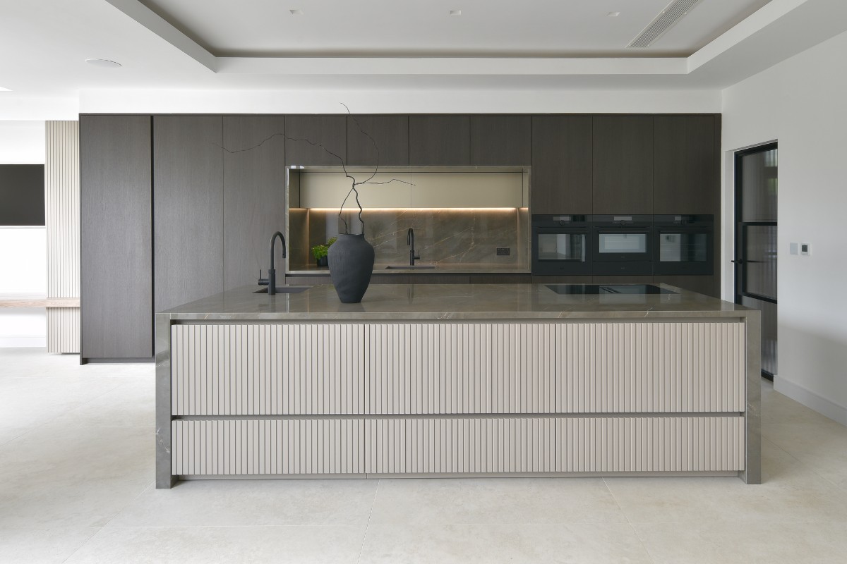 Texture plays a pivotal role in transforming a cool, contemporary kitchen into a tactile and grounded space. Smooth cabinetry gains depth when paired with fluted timber, ribbed glass or leathered stone, inviting both touch and visual interest. The Roundhouse Kinsey project demonstrates this perfectly – its fluted oak cabinets and stone splashbacks bring richness and rhythm without compromising clean lines.