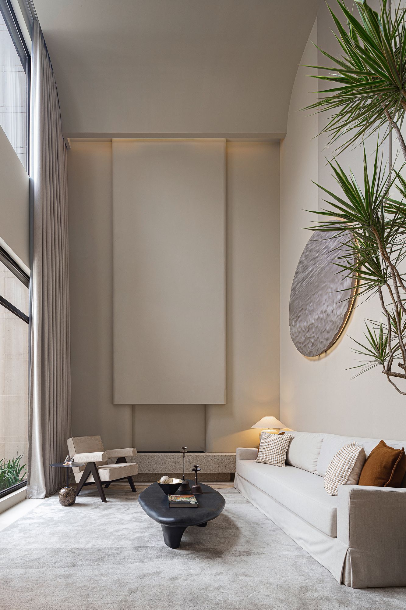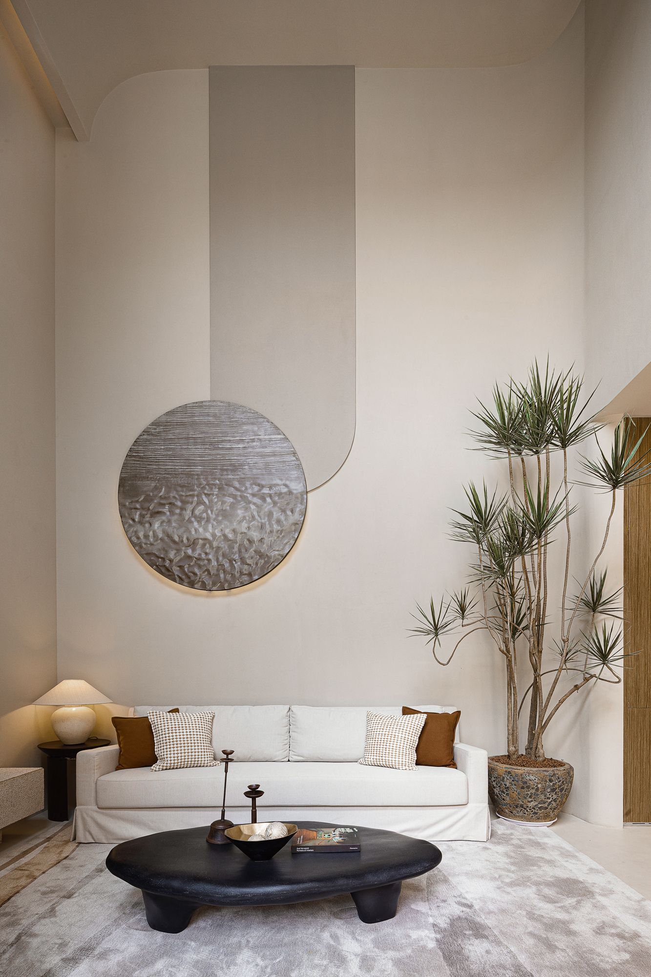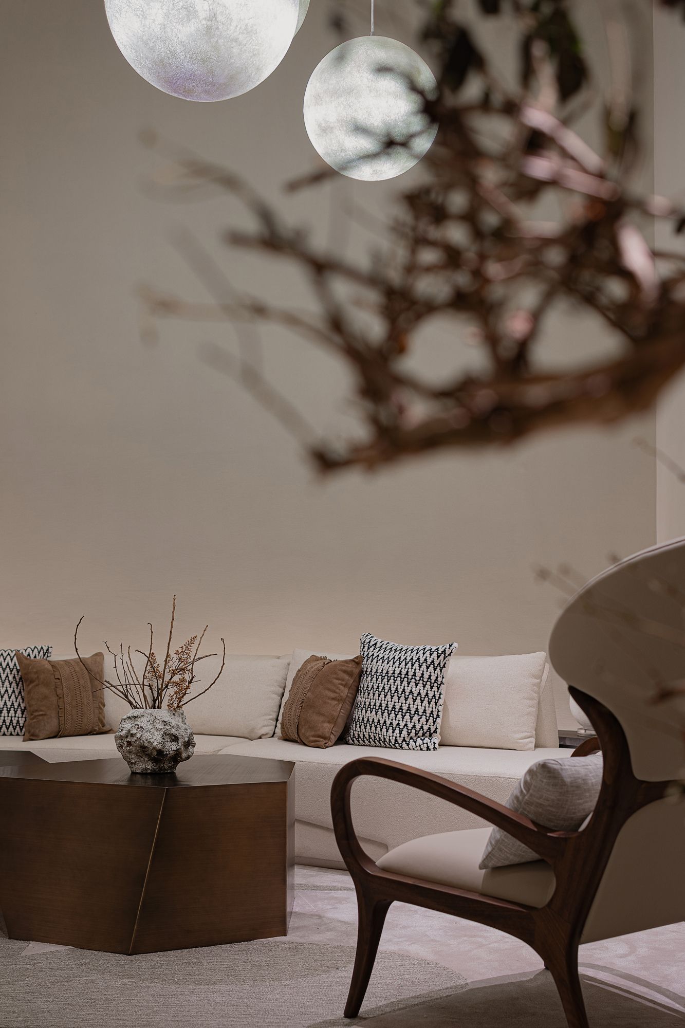 The design draws inspiration from the serenity of nature and the refined aesthetics of modern minimalism. Earthy tones, organic textures, and sculptural forms reflect a harmonious balance between raw elegance and contemporary sophistication. The bespoke wine display and circular dining arrangement take cues from intimate gatherings, reinforcing the idea of connection and timeless luxury.