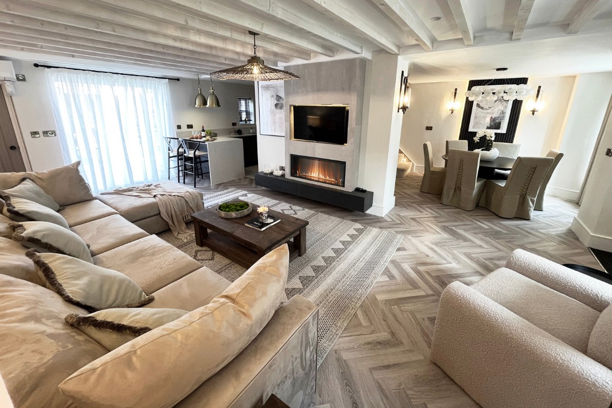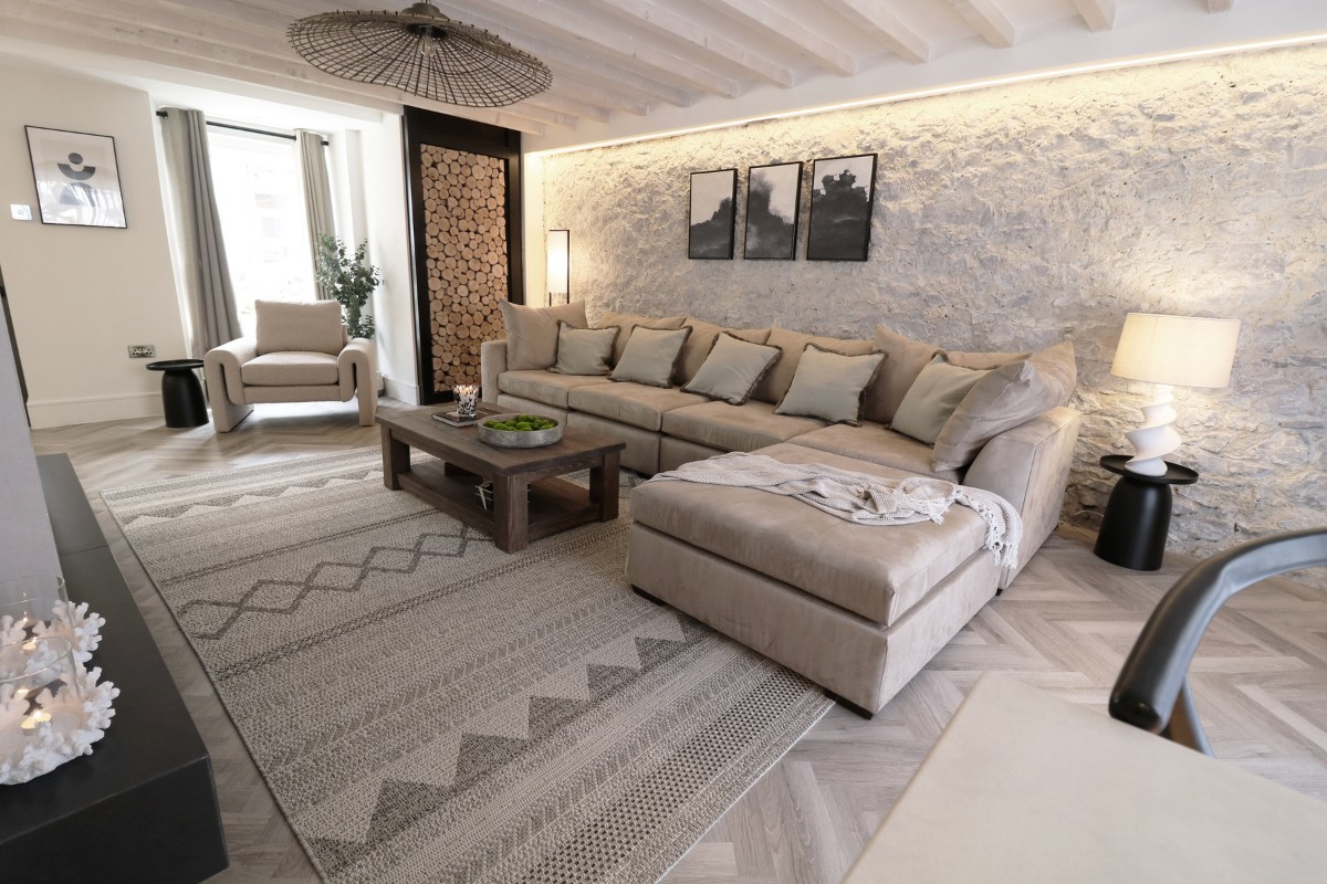 The budget was the toughest hurdle, the construction team also had issues at times with the building itself which chewed into the budget, threatening to reduce the interior budget further. Fortunately I found a great kitchen company who made the kitchen and installed the units and a local quartz / stone constitute supplier who installed the worktops at a great price. We were also resourceful with the interior design, we couldn’t move the meters or the boiler as it would have cost too much and they were so unsightly in the lounge area, so I designed a cupboard to house them with a log effect design which blends in with the rustic feel, blending away the unsightly meters from the lounge area.