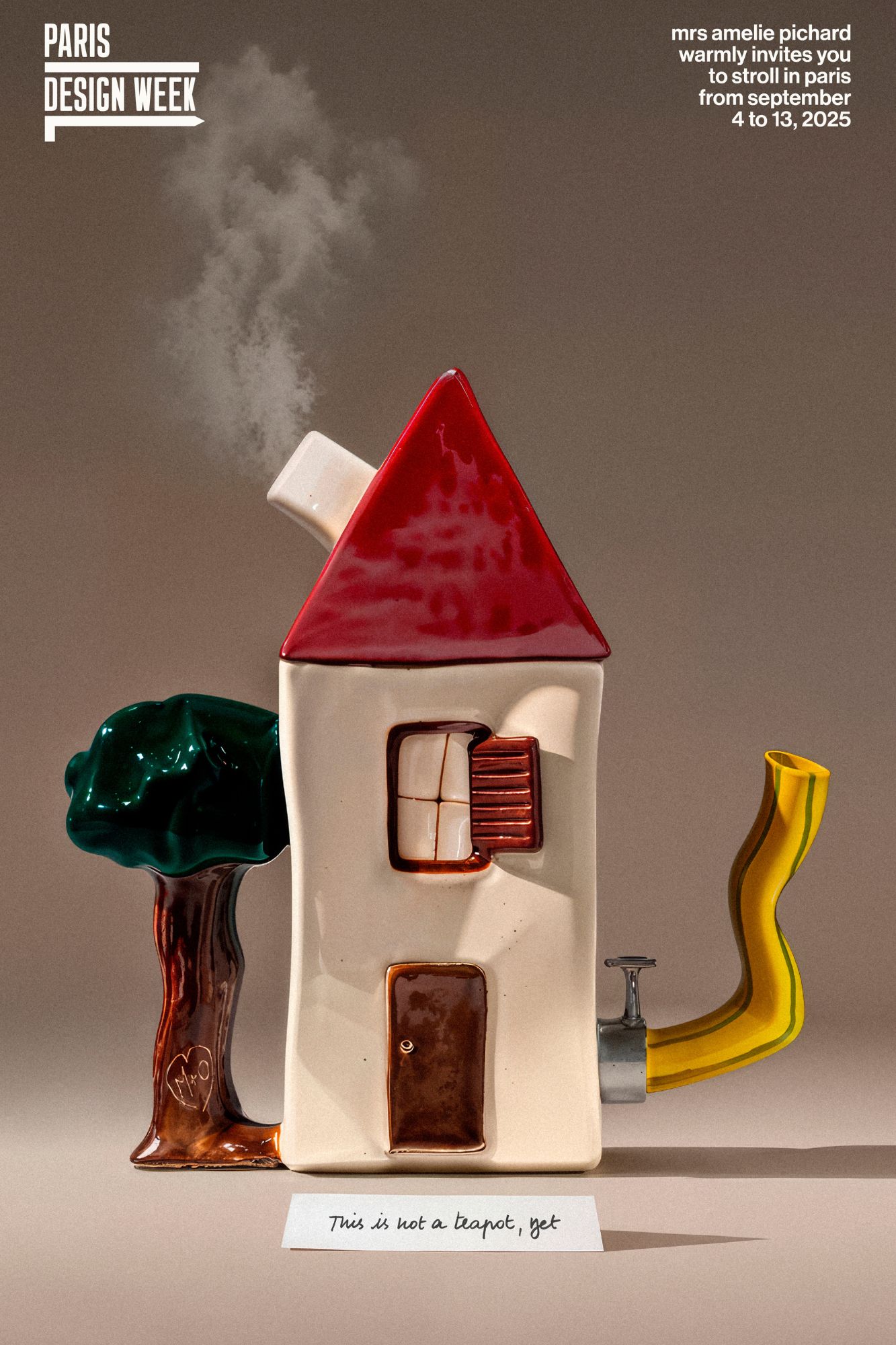 Amélie Pichard brings an open-minded and eclectic vision of design, breaking free from conventions to offer an approach where objects become manifestos of creativity and independence. Balancing energy and intimacy, this invitation showcases a unique object: a teapot-house, or a house-teapot, still in the making.