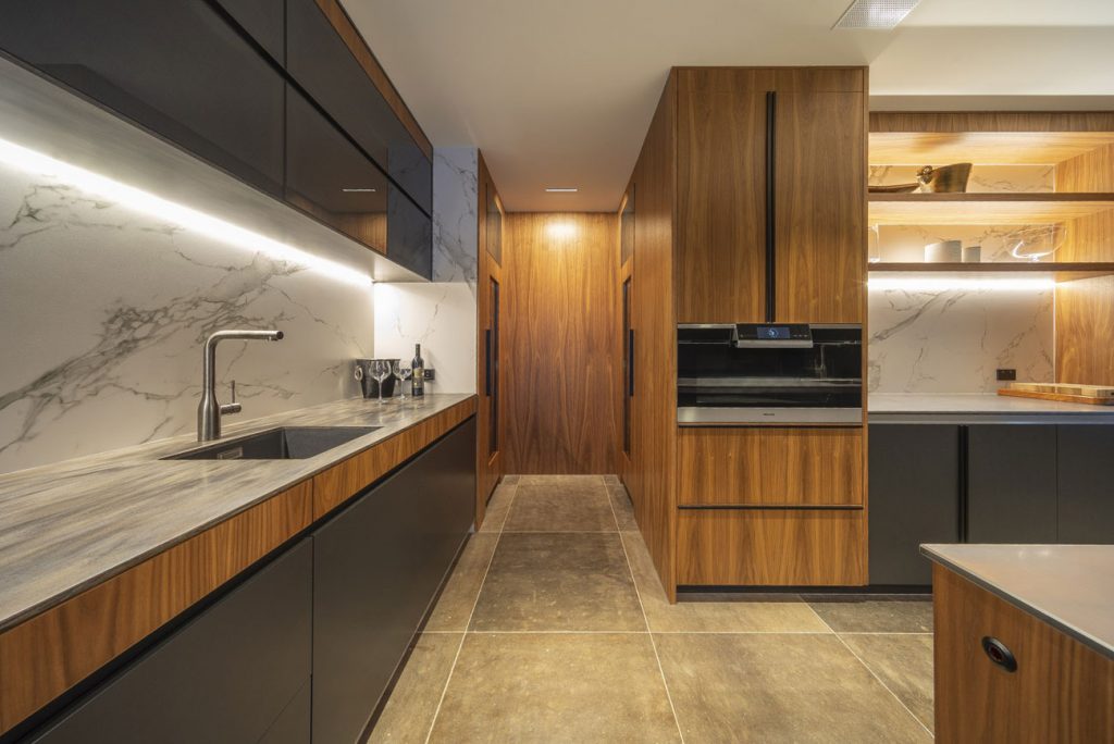 For inspiration, the designer drew from a palette of rich, earthy colours. Under-cabinet lighting complements these tones well and both add a softness to the clean lines and sleekness of the design. Modern materials give this kitchen a contemporary look whilst keeping everything pristine.