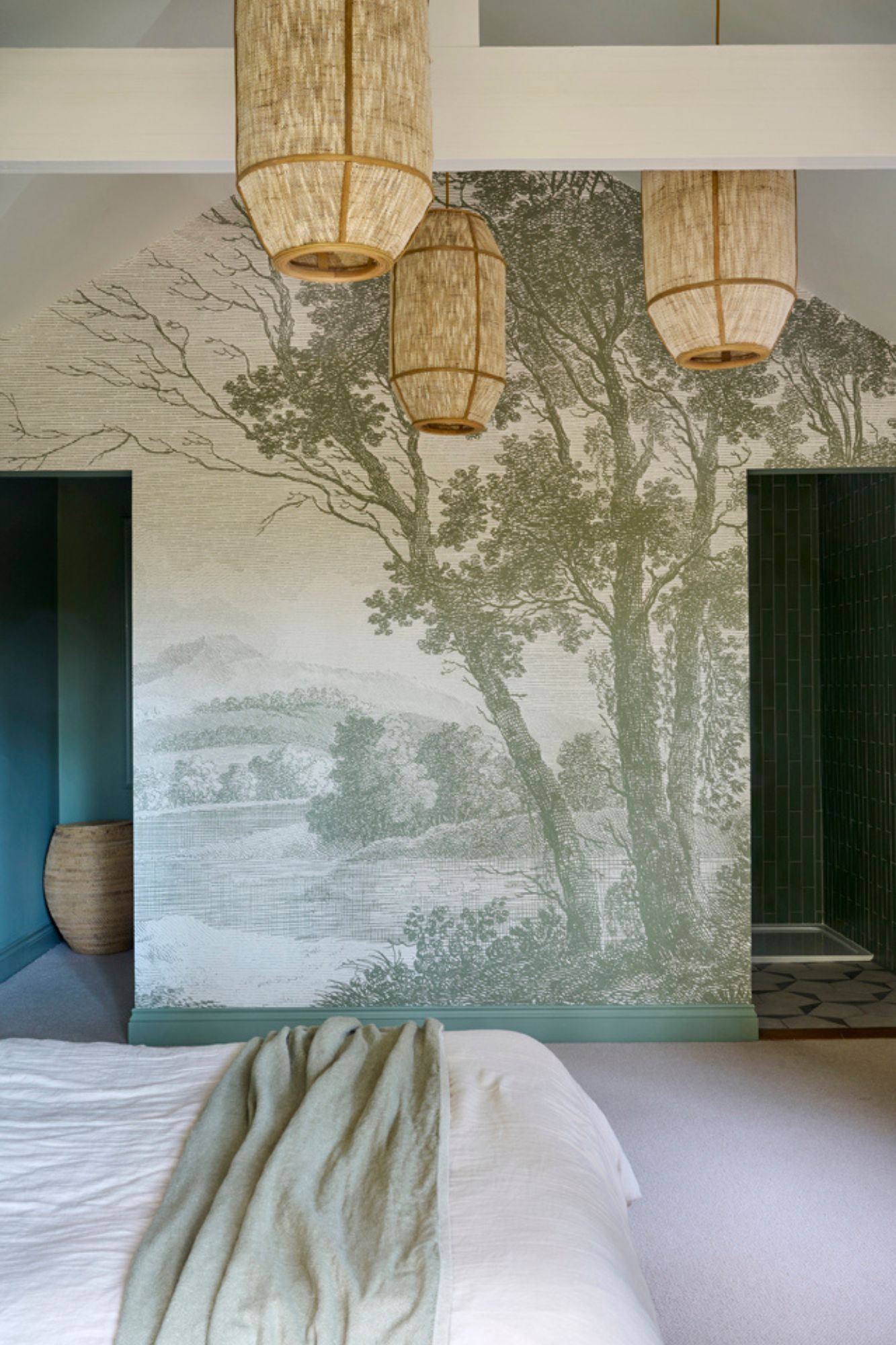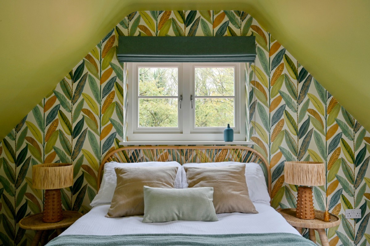 Attention detail features throughout the room, notably the textured finials on the curtain pole, the green floating shelves linking the sage green into the bedroom and creating a cohesive flow. The final result of this bedroom renovation meant it felt more spacious, open, lighter and tranquil.