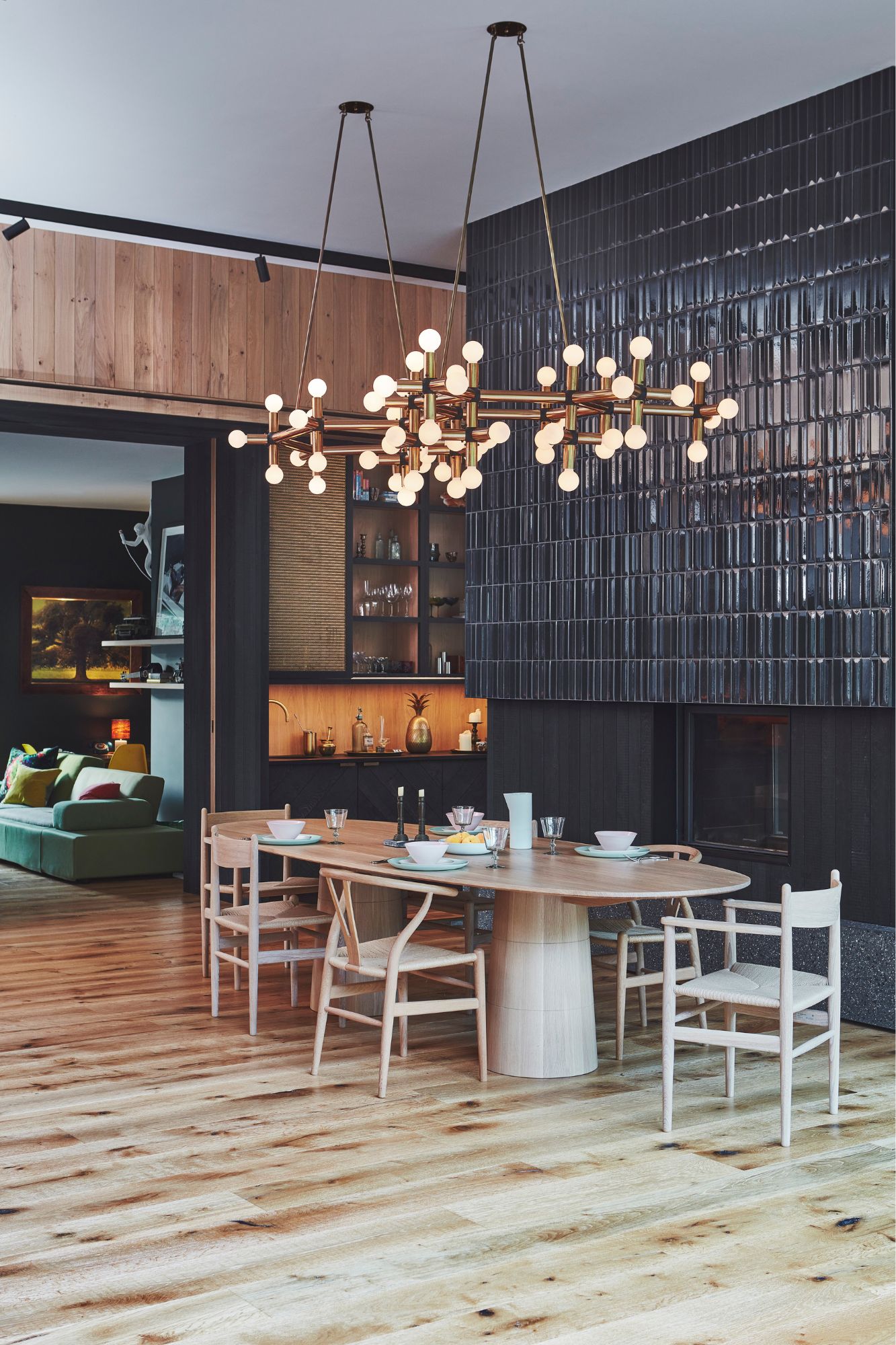 The slatted panelling that now frames the kitchen was the starting point for the dark accents and it links the cabinetry on either side of the living space. There’s a dramatic bulkhead over the island and into the extension so instead of trying to hide it, I decided to make it into a feature. You can see how the rich, dark elements in the design are set amid off-whites, adding definition while keeping an airy feel.