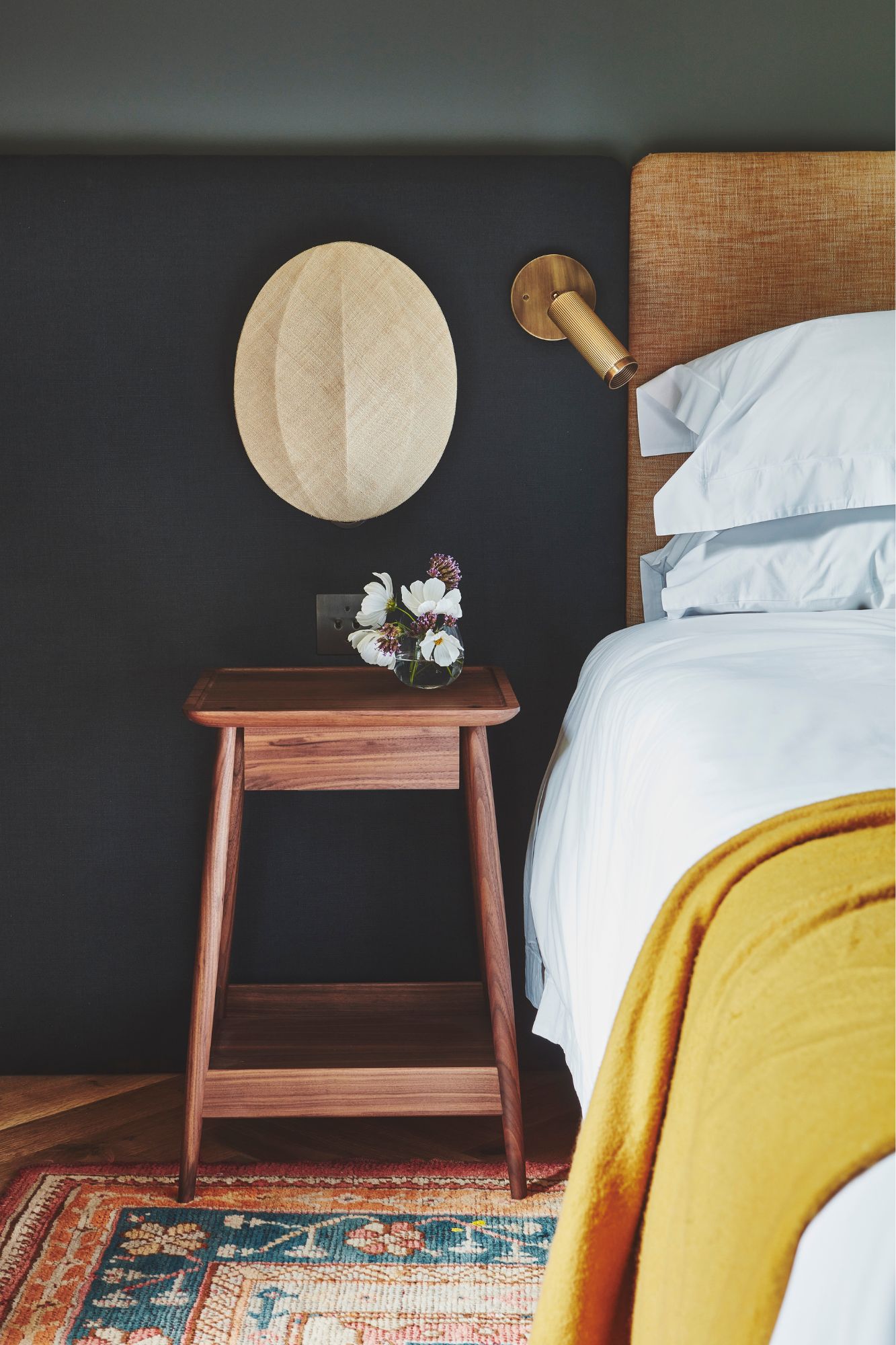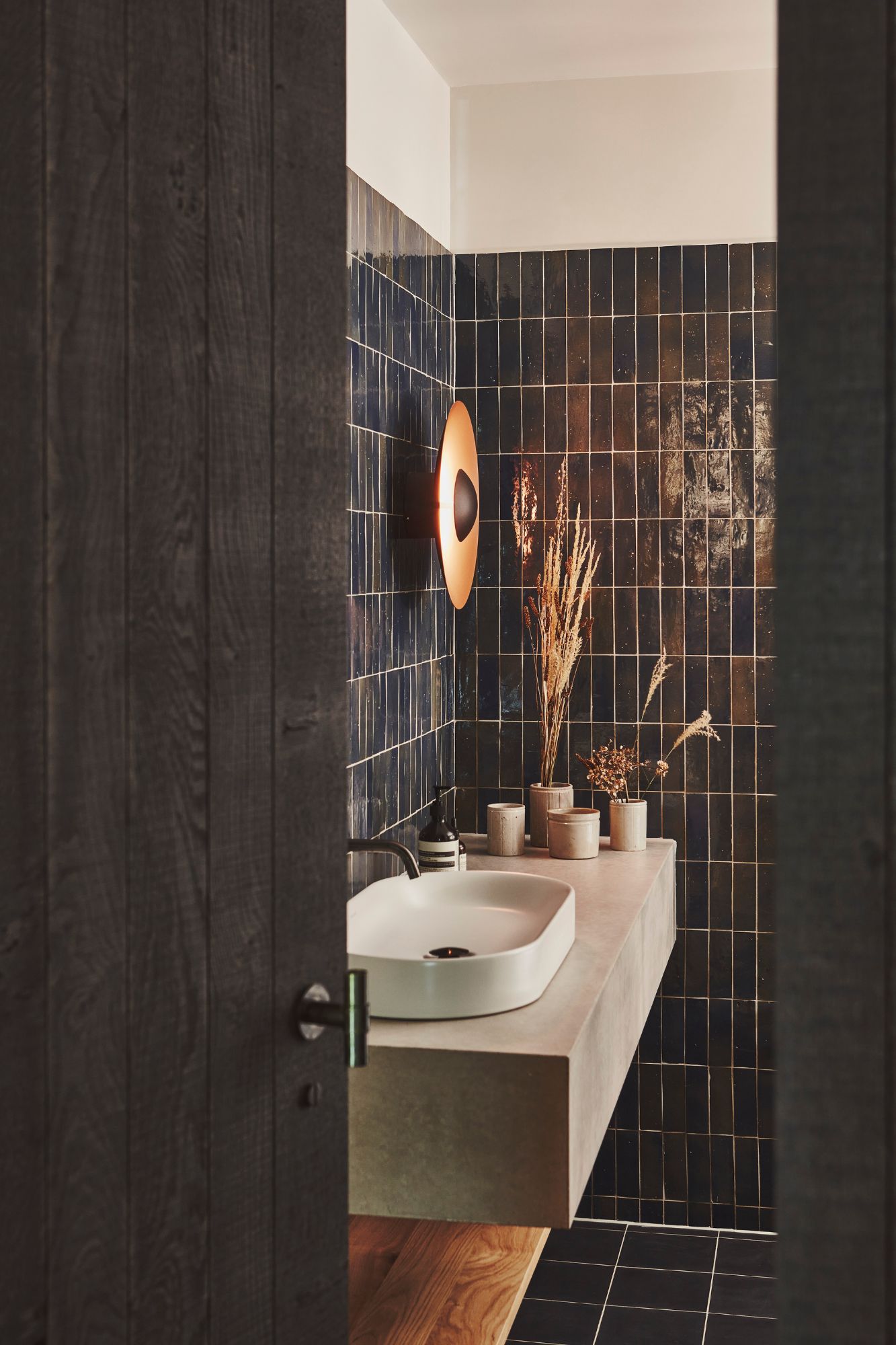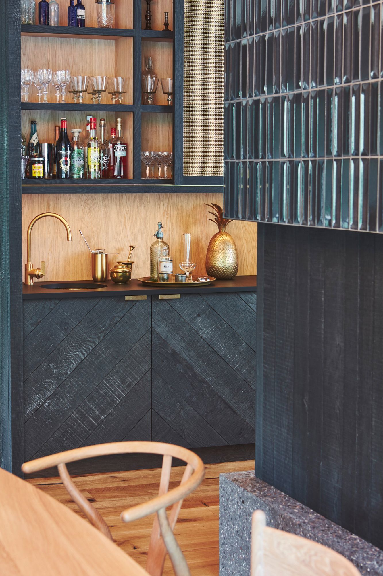 There are several standout finishes that both enliven and pull together the other handcrafted elements in the scheme: - In the living room, for instance, artisans covered our joinery wall in gesso, gold leaf, and a hand-blended mixture of bronze and navy-blue paint. They then stone buffed it into a starry cosmos of tonal variations – an arresting feature that also houses a TV behind a remote-operated door. - While on the opposite wall, a panel of inky-blue polished plaster frames the fireplace we installed. When the sun hits its faceted surface, the wall appears to flicker.