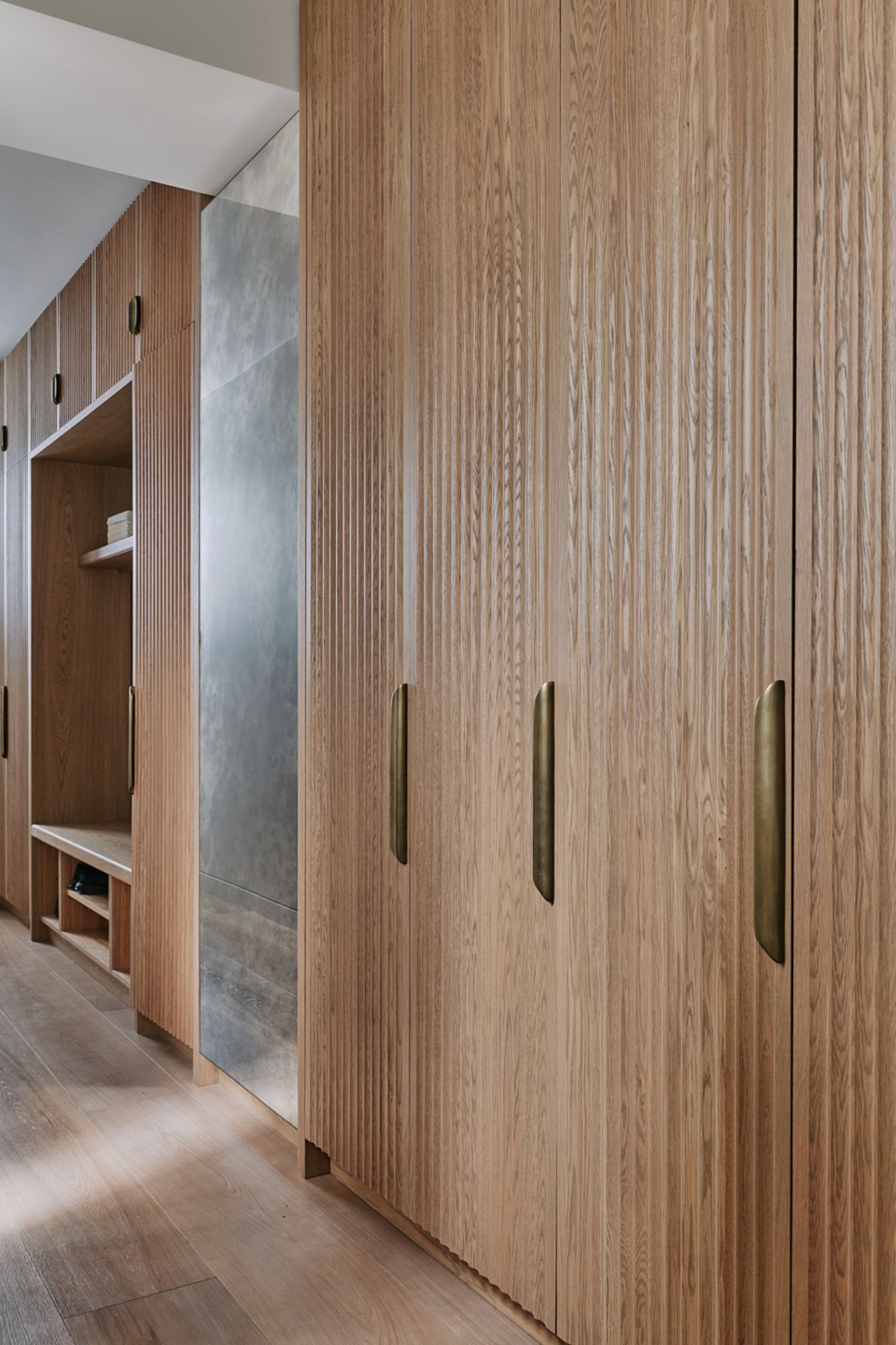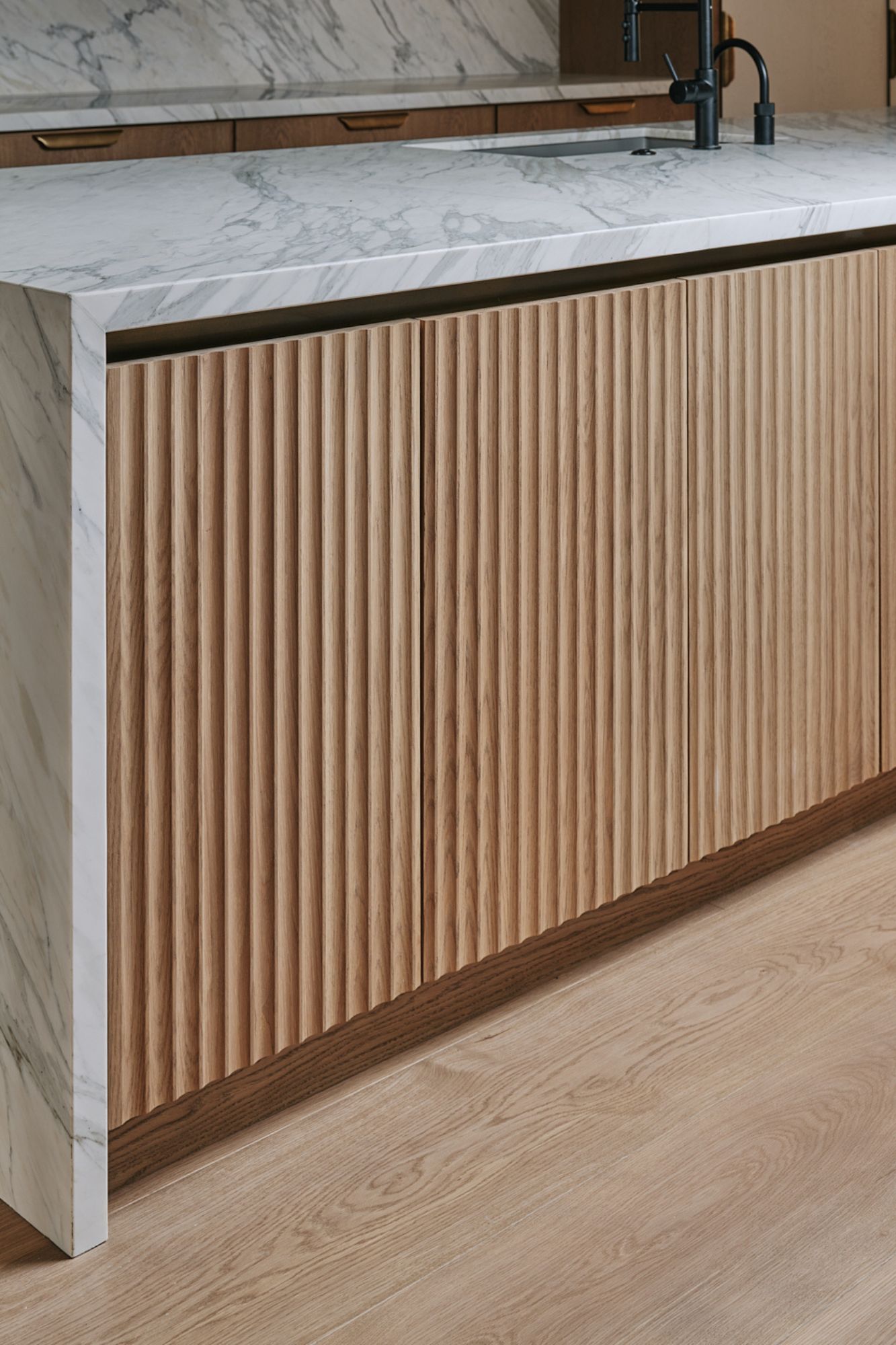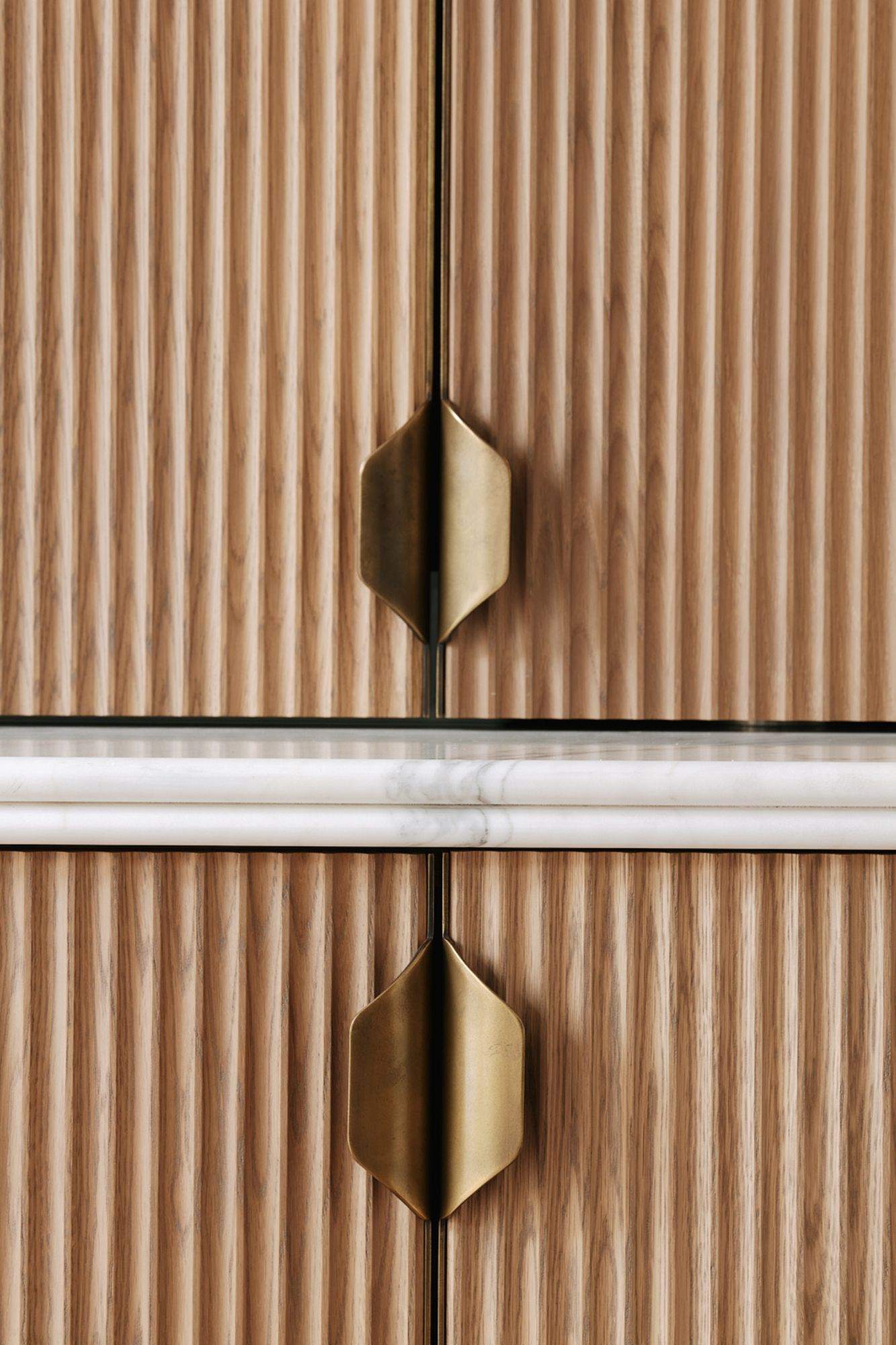 The design was inspired by the client’s desire for balance, something understated yet sophisticated, where every detail contributes to a calm, considered atmosphere. Our use of textured walnut veneers, ultra-matte Fenix finishes, and the dramatic Neolith Calacatta Luxe framing created a refined contrast that feels both warm and contemporary. Further inspiration came from the client’s reference to European design studios, which guided the development of our bespoke solid-brass patinated handles, ultimately becoming a defining feature of the project.