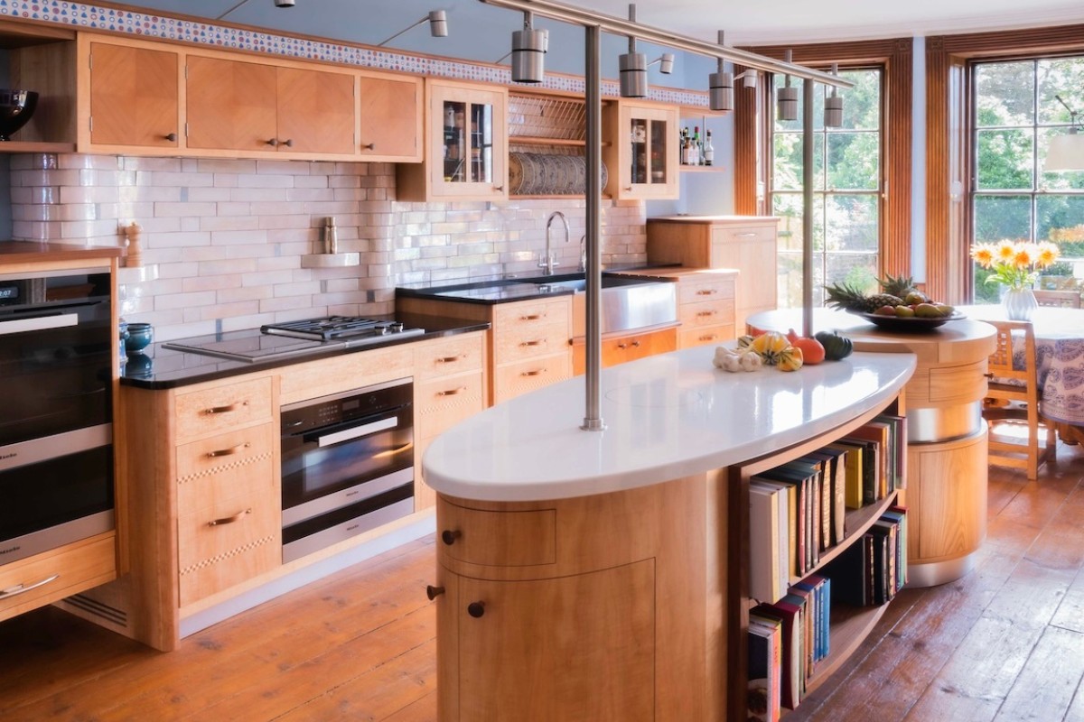 Our designs use multiple style references, allowing them to stand out from fashion trends and obsolescence. Because of this, a thirty-year-old Johnny Grey kitchen still looks modern. Three essential design ideas of mine are in evidence in most, if not all, of my kitchens. Number one is to make eye contact possible as this promotes sociable use of space so that people can have conversations while cooking and preparing food. Number two is ‘soft geometry’ – that is, the avoidance of sharp corners, particularly on furniture like central islands in the middle of a room. Walking around the kitchen feels safe and natural and it means the passageways can actually be narrower. The third principle is the use of dedicated work surfaces instead of indiscriminately long countertop work surfaces. This allows both small and large kitchens to function efficiently, often with reduced distances between key activities. It frees up space for sociable furniture.