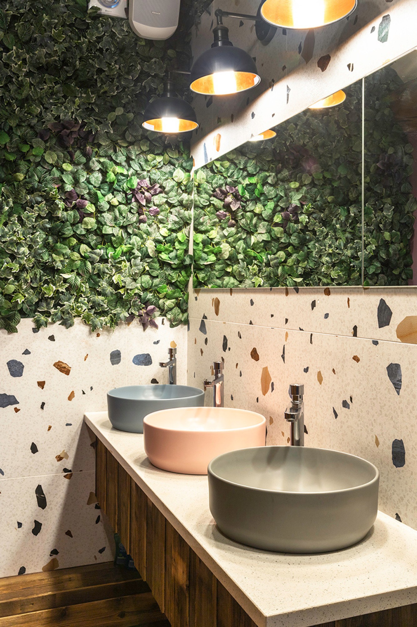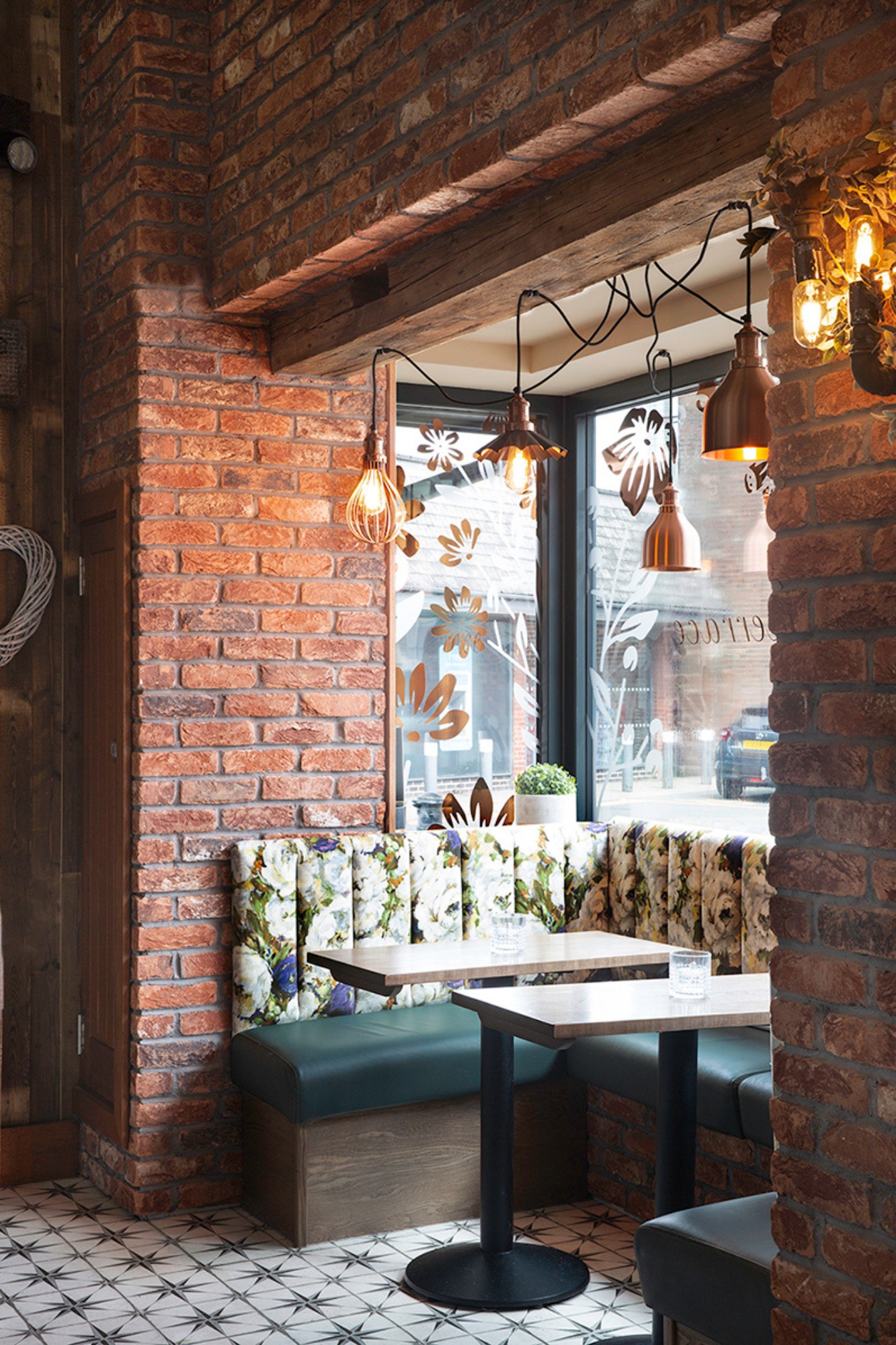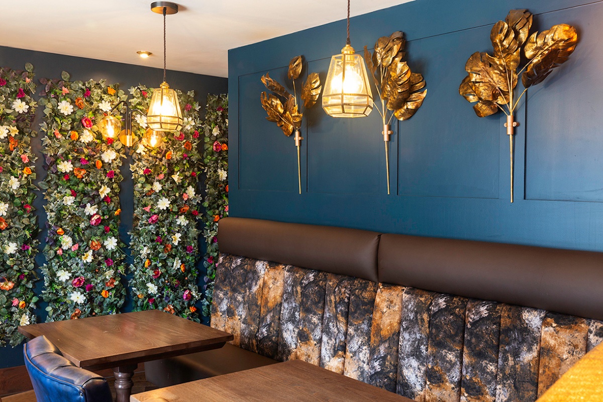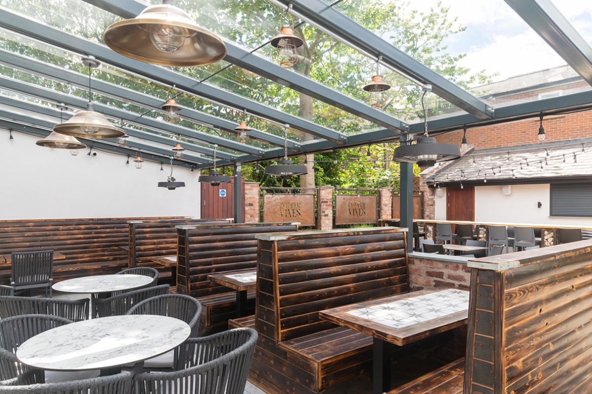 In addition, to soften the space, extensive real and faux planting has been used throughout the interior. At the rear courtyard has been extensively remodelled to include an aluminium and glass canopy over a decked veranda, an external bar, stone paved patio, copper panels and laser cut screens to perimeter walls and Festoon lighting.