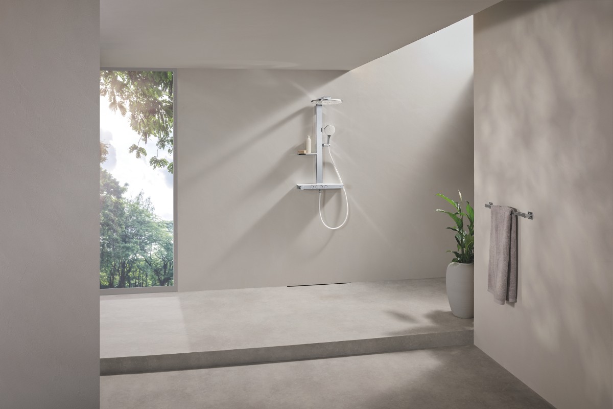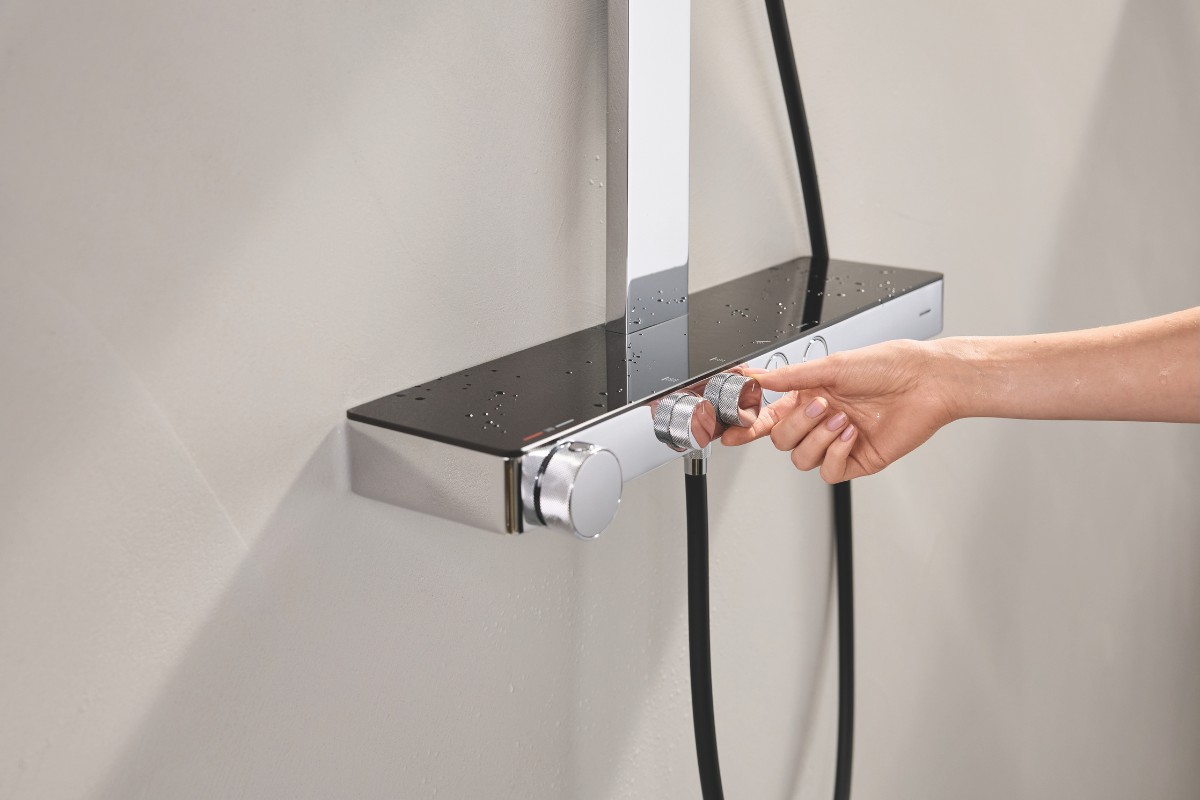 GROHE Rainshower Aqua Pure is available across the palette of the GROHE Colours Collection, empowering a tailored design vision. For the chrome version, architects and designers can select between white and black acrylic glass spray faces for the hand and head showers as well as the safety glass on the thermostat. All other colours come with black glass accents. The shower system can be complemented with a shelf made of high-quality safety glass and metal. It is adjustable in height, offering additional storage space while also enhancing the shower’s aesthetics. Thanks to this customisable design versatility, GROHE Rainshower Aqua Pure extends the reach of the high-quality GROHE SPA portfolio and matches perfectly with other GROHE SPA lines like GROHE Allure—for a harmonious, coordinated space that emanates calmness and serenity.