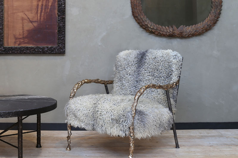 The Siren Chair was created by Cox London for Collect at Somerset house in March 2020. This generously proportioned chair is traditionally upholstered with natural lamb’s wool for great comfort, supported by sculptural cast-bronze arms and a forged iron frame. Both visceral and flocculent, the beguiling chair is signed and numbered by the artist. Special editions available in different finishes and different fabrics. The founders, Christopher and Nicola Cox take inspiration from the great traditions and techniques of making; their work is craft orientated, sculpture based and infused with historical references.