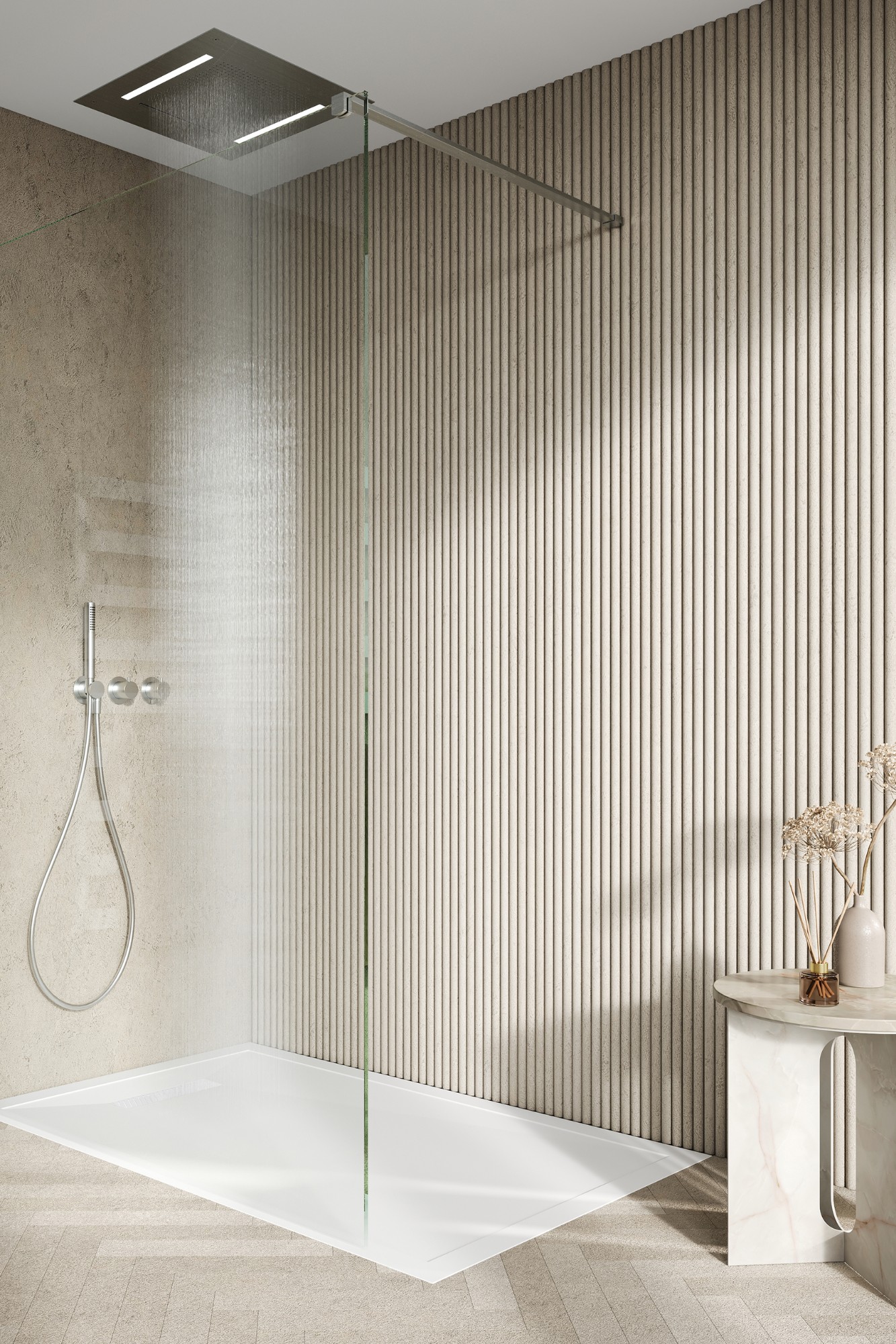 Using natural materials embraces relaxation and wellness principles that instil a sense of natural tranquility. Brilliantly resilient and hard-wearing with exceptional impact resistance, engineered stone retains water thermal temperature for longer, creating a warm and luxurious showering experience.