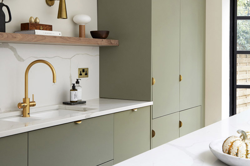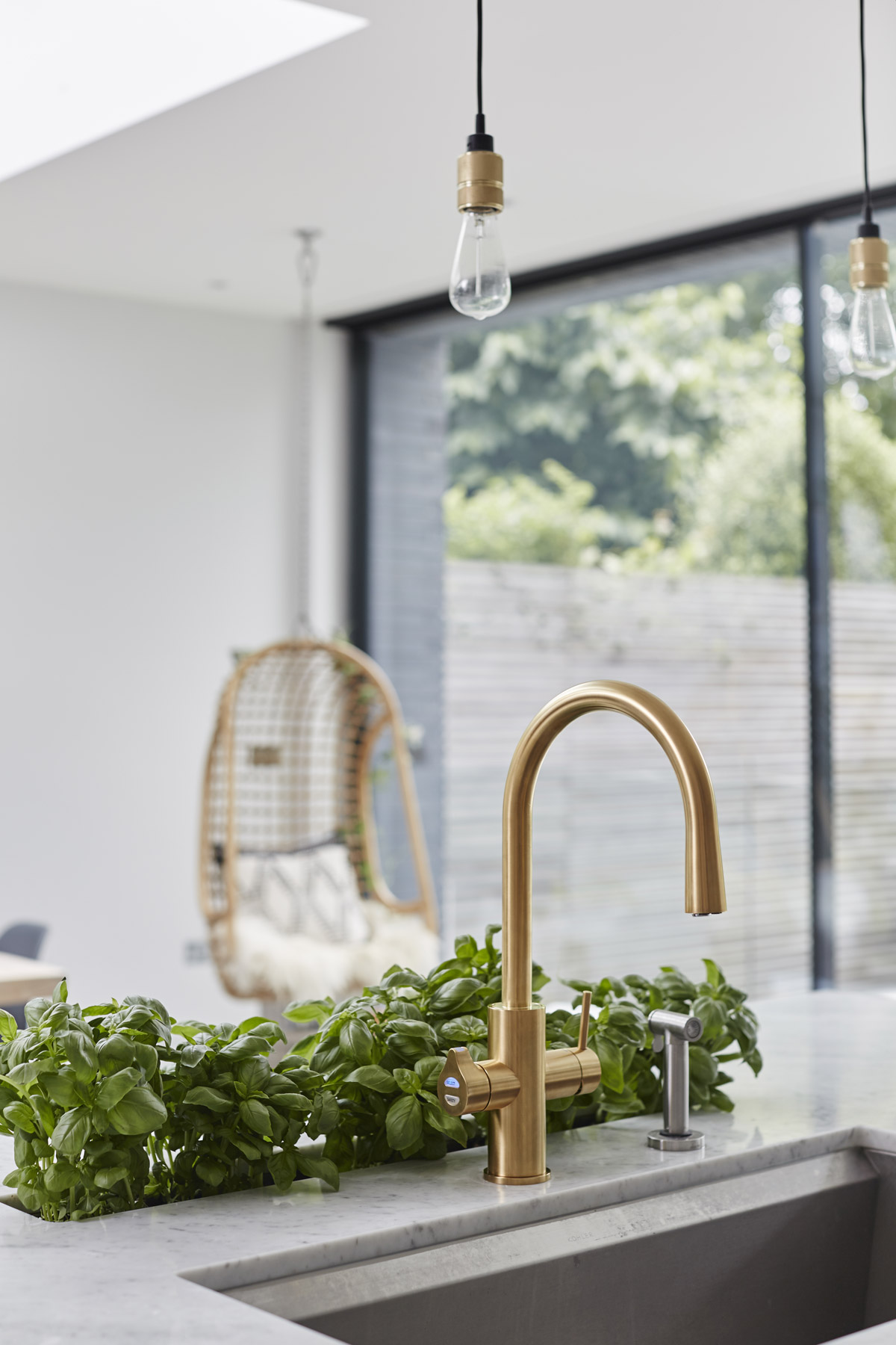 Owner of interior design company Studio Fortnum, Rebecca Wakefield has been gradually renovating her own home to create a light, airy and calming living space after purchasing it in a dilapidated state in 2016. After spotting that the number one luxury, top of the wish list item in her clients homes is a boiling water tap, Rebecca started to consider how much she’d benefit from one, as long as it could fit in well with her green and brass colour scheme.